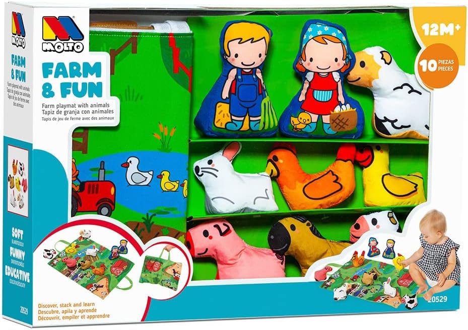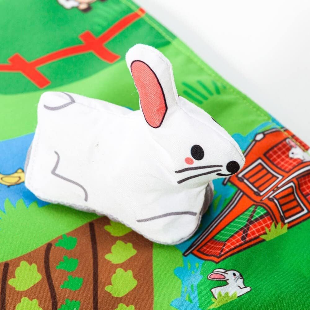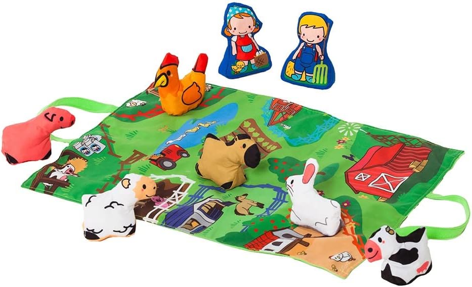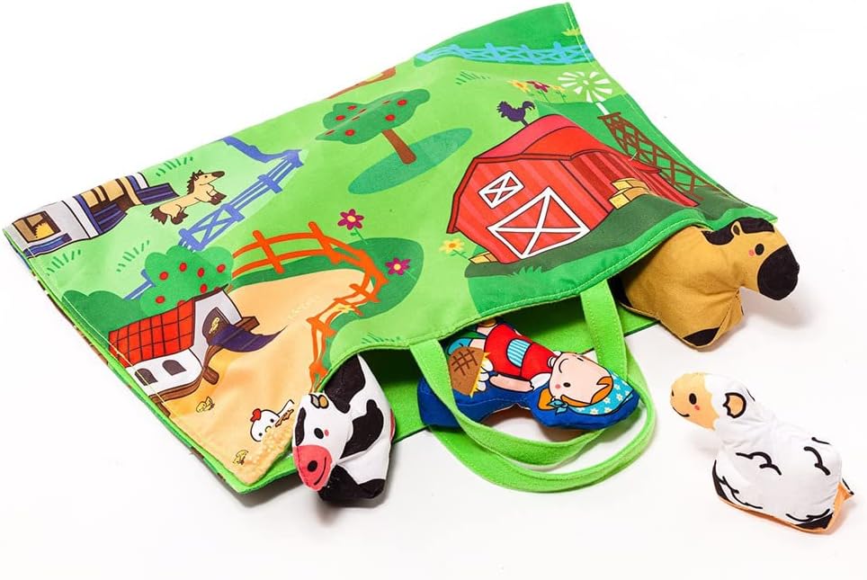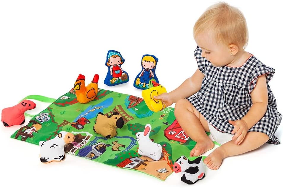 Tapete com animais de quinta, com Lily, Marc e seus 7 animais, coloque cada animal em seu espaço, aprenda seus nomes, brinque e experimente com seus diferentes sons e cores e assim que terminar colete seus brinquedos na mesma tapeçaria que se torna uma bolsa.