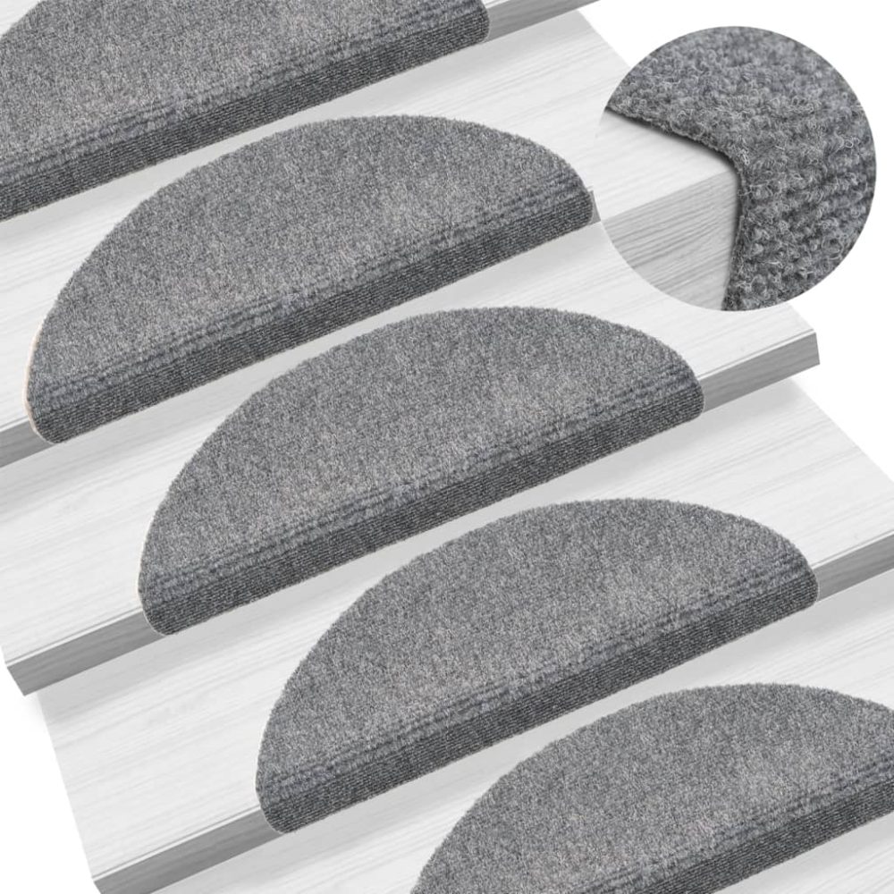 Estes tapetes são feitos num tecido forte agulhado, por isso amortecem o ruído e são antiderrapantes, quentes e confortáveis. Estes tapetes também são laváveis e dobrados para proteger tanto a parte superior como frontal das escadas. Os pontos adesivos na parte de trás permitem que os tapetes sejam presos às escadas de forma fácil e rápida.