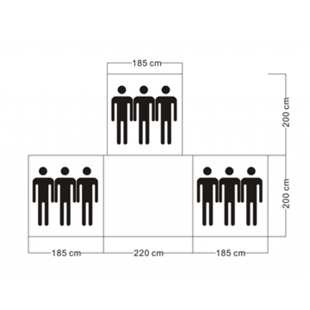 Este grande tenda é perfeito para todas as suas ocasiões de acampamento !! Ele tem um interior confortável adequado para acampar ao ar livre, viajar e para férias em um acampamento. É suficiente para alojar até 9 pessoas. Dispõe de 3 compartimentos diferentes, cada um dos quais oferecendo amplo espaço para acomodar 3 pessoas no máximo. Também é fácil de montar e demora apenas alguns minutos até desmontar para armazenamento. Existem 2 hastes incluídas para criar um toldo de entrada. O material da parede interior é respirável. O piso tem um filme de PE à prova d’água deixando-lo seco e limpo. Para ter uma tenda à prova d’água 100%, aconselhamos-lhe que pulverize a tenda com um spray resistente à água. Ele também tem uma rede mosquiteira na cabine de dormir para as suas noites de verão livre de insetos.