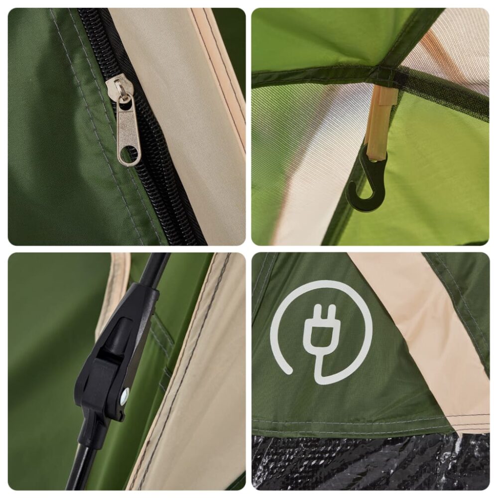 Esta tenda familiar com um aspeto moderno protege-o das intempéries e proporciona um local confortável para aventuras de todo o tipo. Design totalmente à prova de água: esta tenda de campismo, feita de poliéster com revestimento de PU, é à prova de água e resistente ao vento. As costuras coladas evitam eficazmente a infiltração da água da chuva, enquanto a cobertura de chão resistente ajuda a manter o interior seco e confortável.Sistema de libertação rápida: configure a tenda sem esforço com o sistema de libertação rápida! Deite a tenda, estenda os postes pré-montados até que se fixem no devido lugar e está pronta!Boa ventilação e proteção contra mosquitos: as paredes de malha não só oferecem uma excelente ventilação, como também mantêm eficazmente os insetos afastados, garantindo aos utilizadores uma experiência confortável e livre de insetos.Acesso conveniente para cabo elétrico: a porta E permite-lhe ligar facilmente um cabo de extensão de uma fonte de alimentação externa à sua tenda.Leve e portátil: o design dobrável e leve permite-lhe embalar facilmente a tenda e guardá-la no saco de transporte incluído para facilitar o transporte. Atenção:Mantenha todas as chamas e fontes de calor afastadas do tecido deste produto.