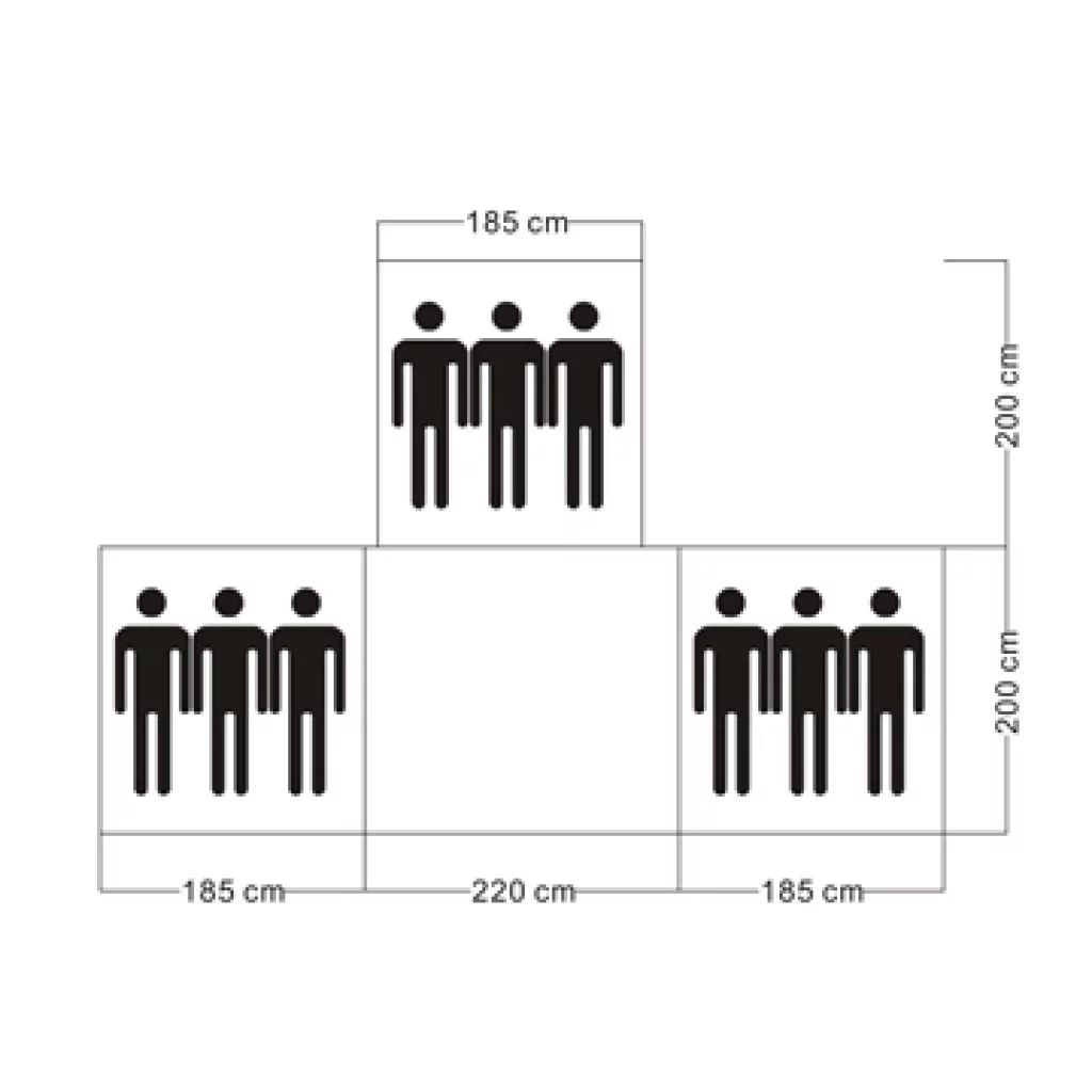 Com um interior extremamente confortável é adequado para acampar ao ar livre, viajar ou para as férias em um acampamento. Esta tenda é ampla, suficiente para acomodar até 9 pessoas. Dispõe de 3 compartimentos diferentes, cada um tem espaço para acomodar no máximo 3 pessoas.
