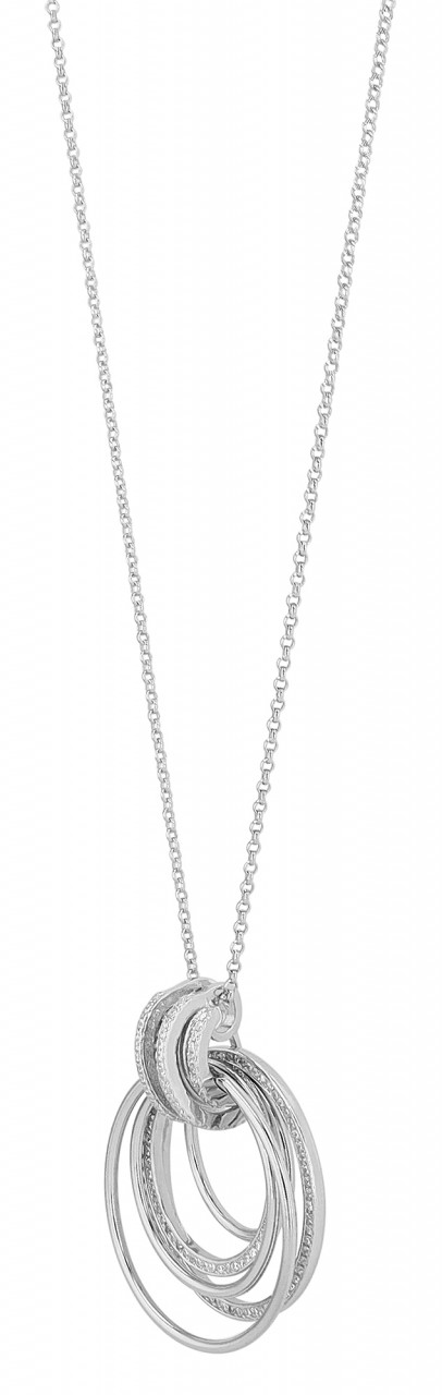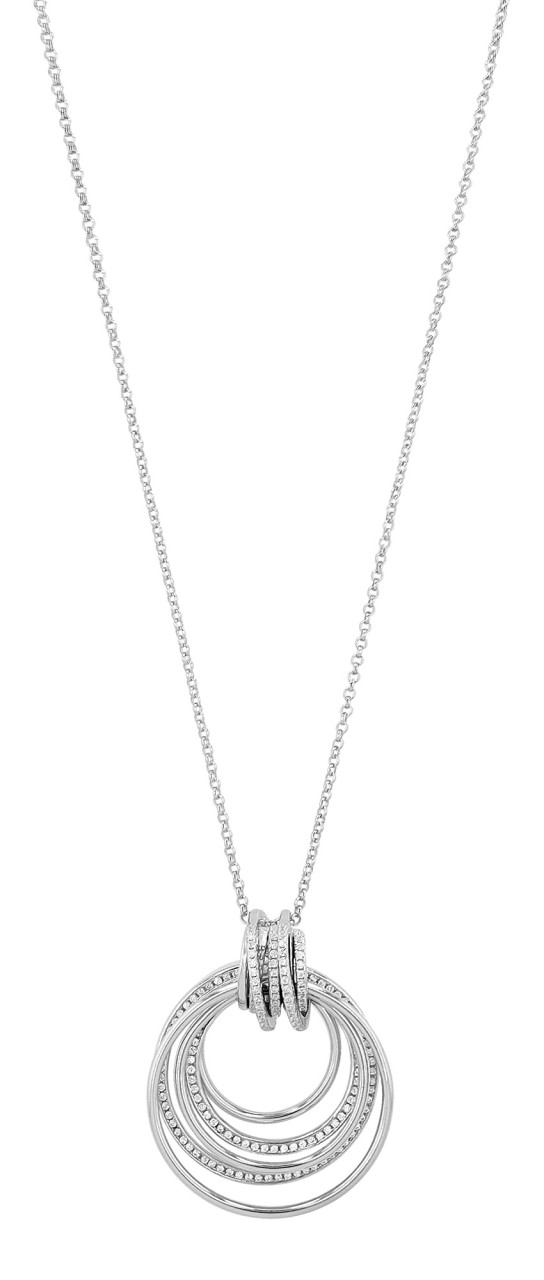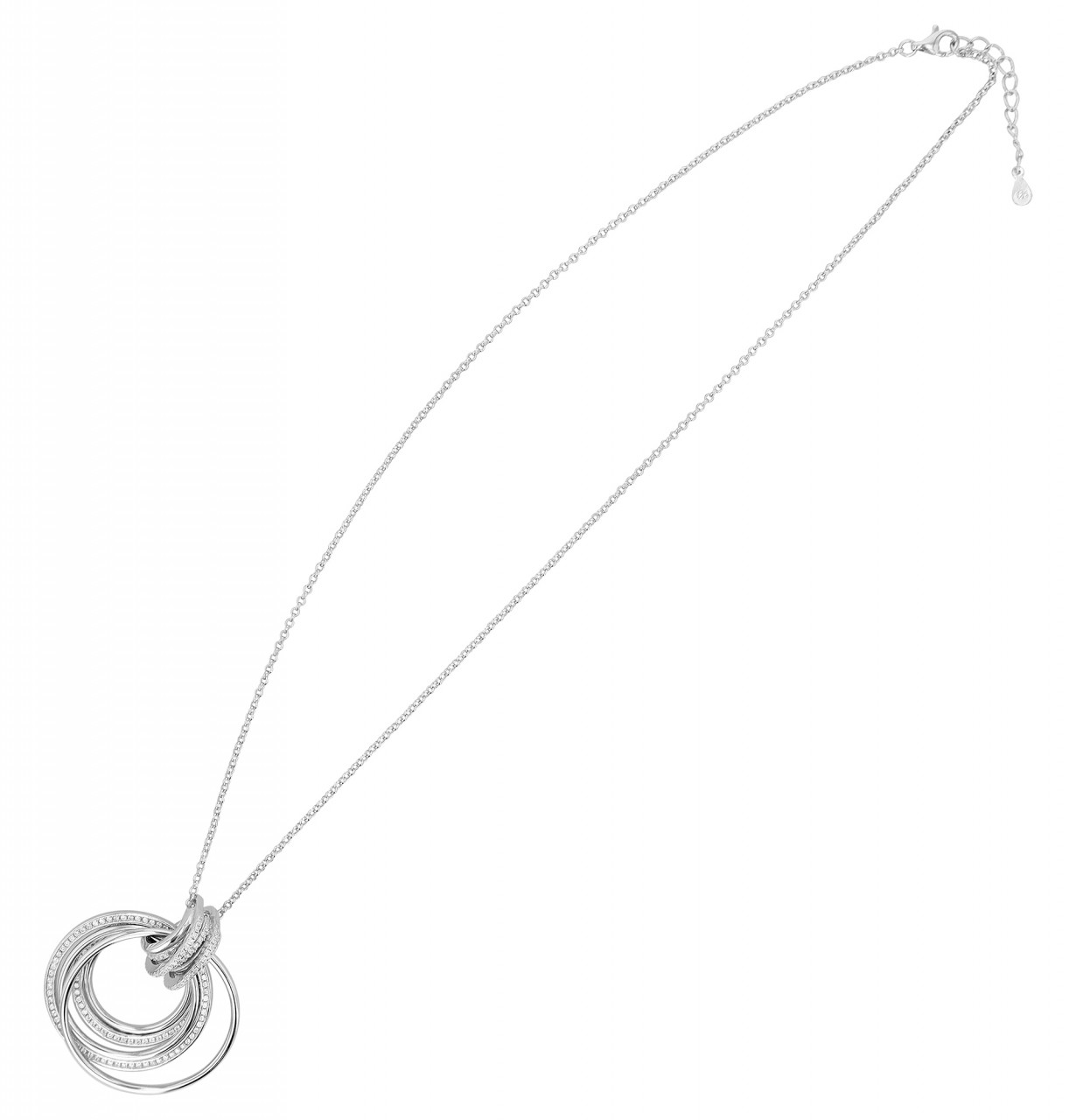 Este colar extraordinário feito de prata esterlina 925 de alta qualidade é um verdadeiro chamariz. O pendente impressionante é composto por cinco argolas móveis que se encolhem para dentro, duas das quais são engastadas com pedras semelhantes radiantes. O ilhó pendente de 15 x 10 mm, integrado de forma permanente, é caracterizado por cinco argolas imóveis, completamente decoradas com pedras semelhantes, que completam harmoniosamente o design. A corrente é ajustável de forma flexível graças a uma extensão de 3 cm e pode ser usada até um comprimento de 45 cm, permitindo-lhe adaptar-se perfeitamente aos seus desejos e ao seu conforto de utilização. O banho de ródio de alta qualidade protege contra as manchas e proporciona um brilho duradouro. Uma peça de joalharia que confere elegância a qualquer conjunto graças ao seu design invulgar e aos seus detalhes brilhantes e que chama a atenção em qualquer ocasião.