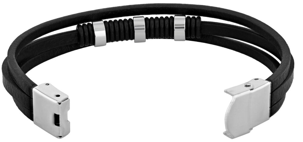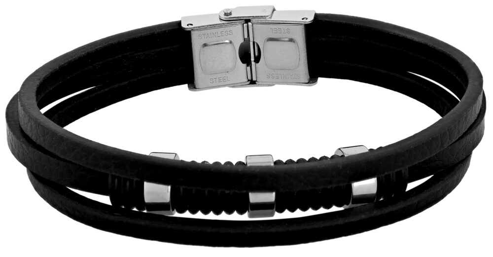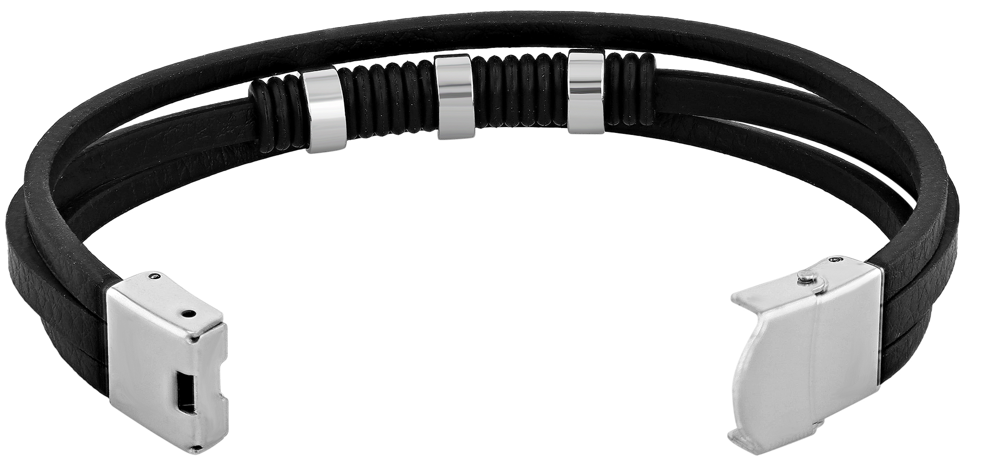 - A pulseira da marca Akzent, fabricada em pele genuína, apresenta um design em camadas com três tiras finas.