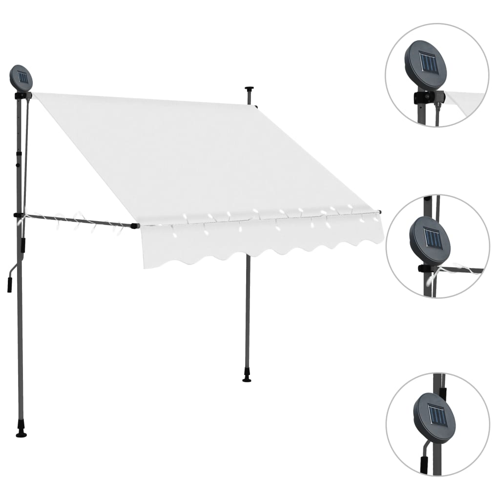 Este toldo repelente de água e sujidade, resistente a intempéries e aos raios UV, é feito em poliéster de alta qualidade revestido a PU. A estrutura de aço forte torna o toldo robusto e durável. O toldo de poliéster é fácil de limpar e pode ser removido e lavado. Graças à manivela, este toldo é retrátil. A altura e o ângulo do toldo também podem ser ajustados. As luzes LED alimentadas pela energia solar fornecem iluminação economizadora de energia à noite. O toldo é fácil de montar.