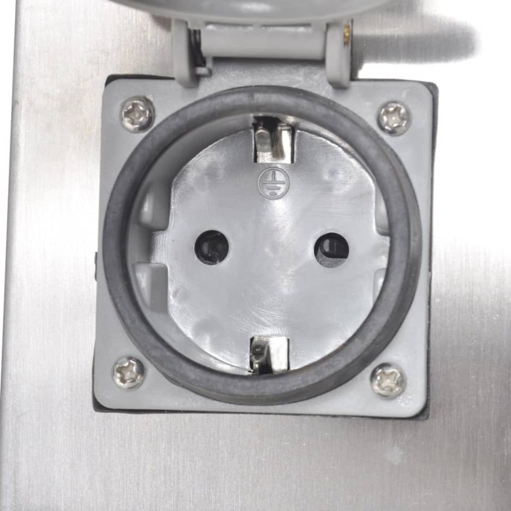 - Material: carcaça de aço inoxidável + tomadas de plástico