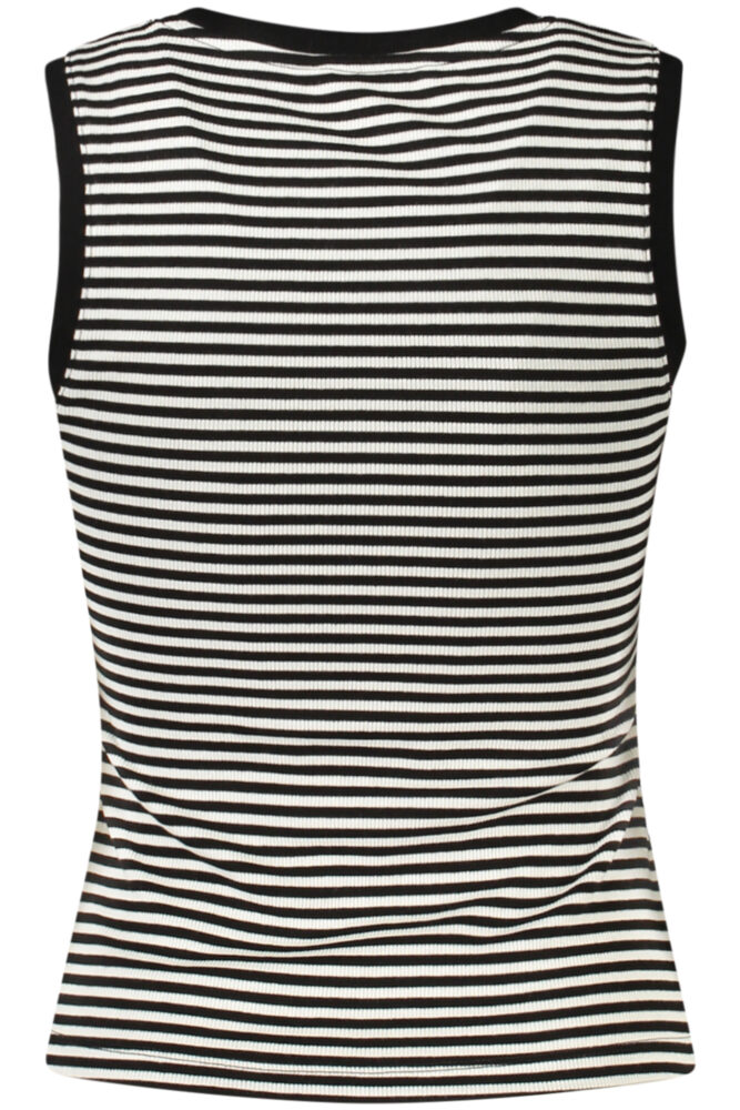 Apresenta decote largo e padrão às riscas, oferecendo um visual leve e descontraído.