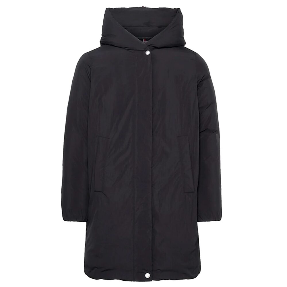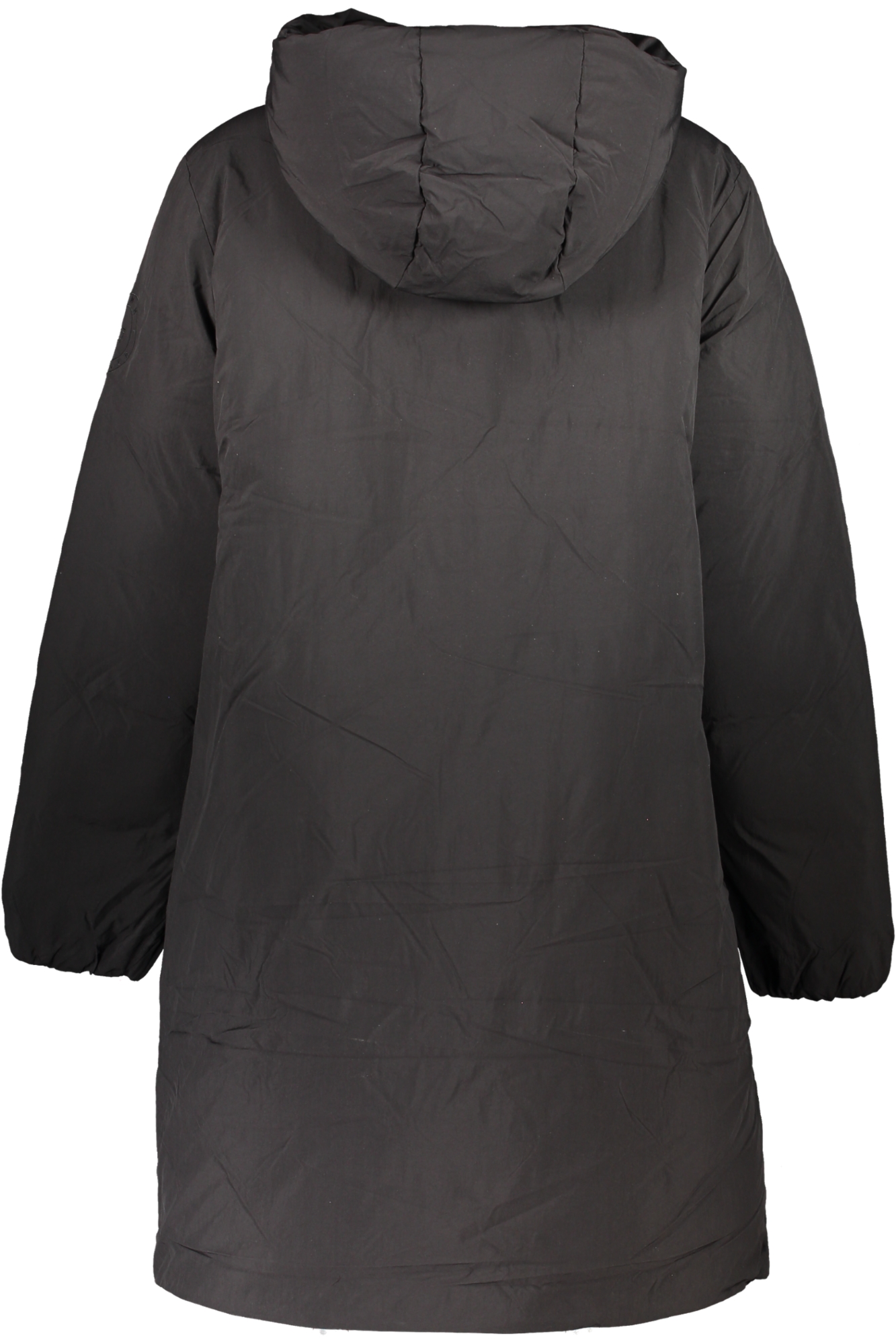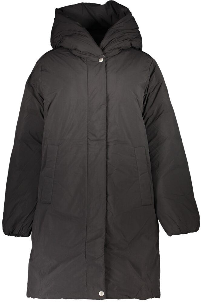 Casaco de manga comprida, com capuz, 2 bolsos externos, botões e zíper, repelente à água, logo