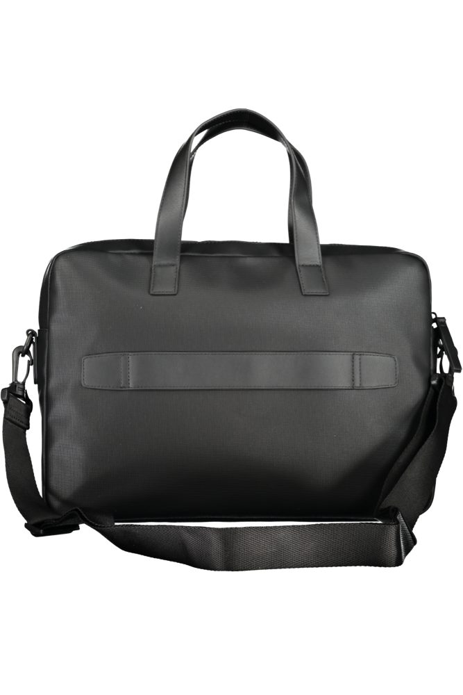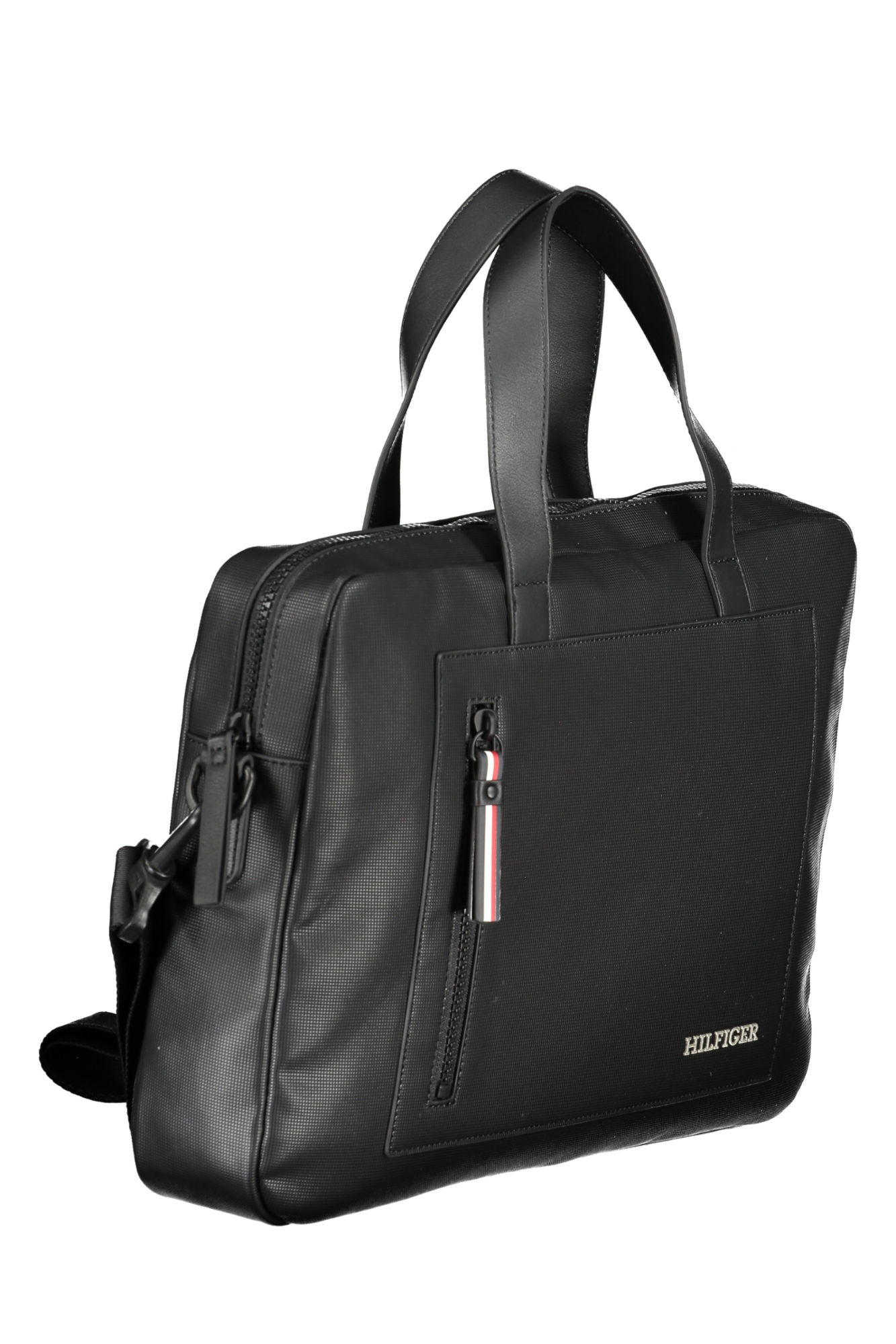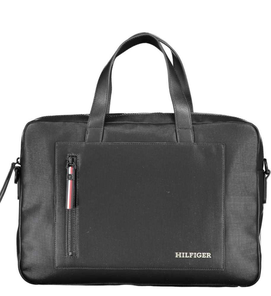 Mala com 2 pegas, 1 alça de ombro ajustável e removível, 1 bolso externo e 1 interno, 1 compartimento interno para pc, espaços para documentos e canetas, fecho, detalhes contrastantes e logótipo.