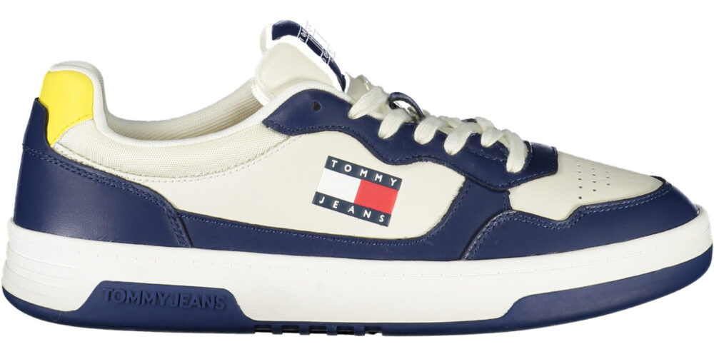 Sapato esportivo com cadarços, detalhes contrastantes em branco e amarelo, palmilha removível, estampa, logotipo
