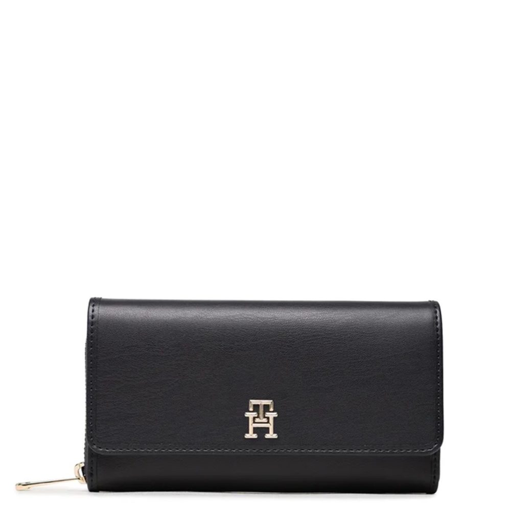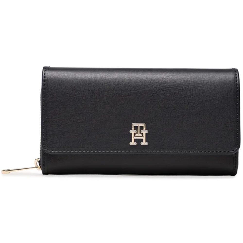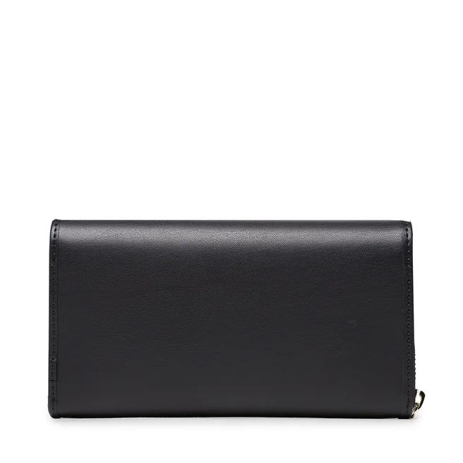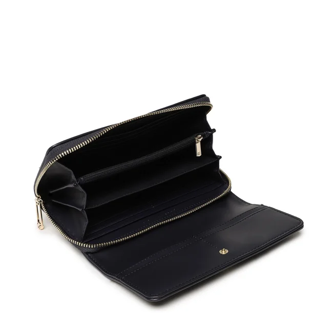 Carteira com 5 compartimentos, bolsa de moedas, espaços duplos para cartões, detalhes de contraste, zíper e fecho automático, logótipo.