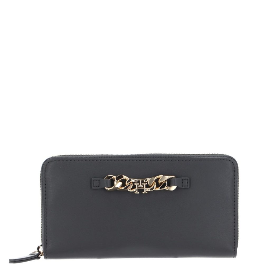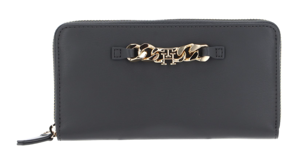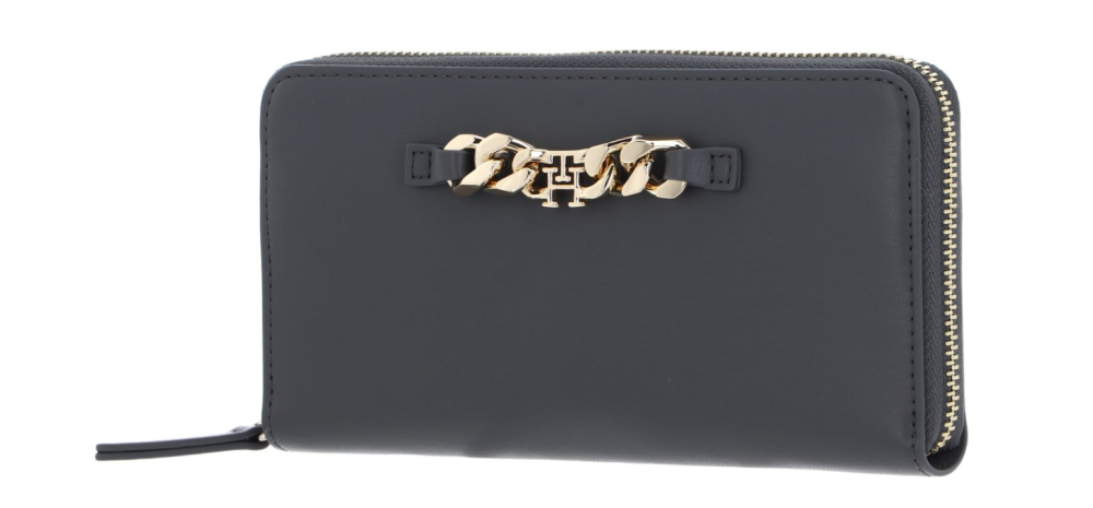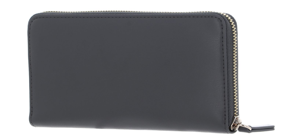 Carteira com 4 compartimentos, espaços duplos para cartões, porta moedas, detalhes contrastantes, fechamento zip, logotipo