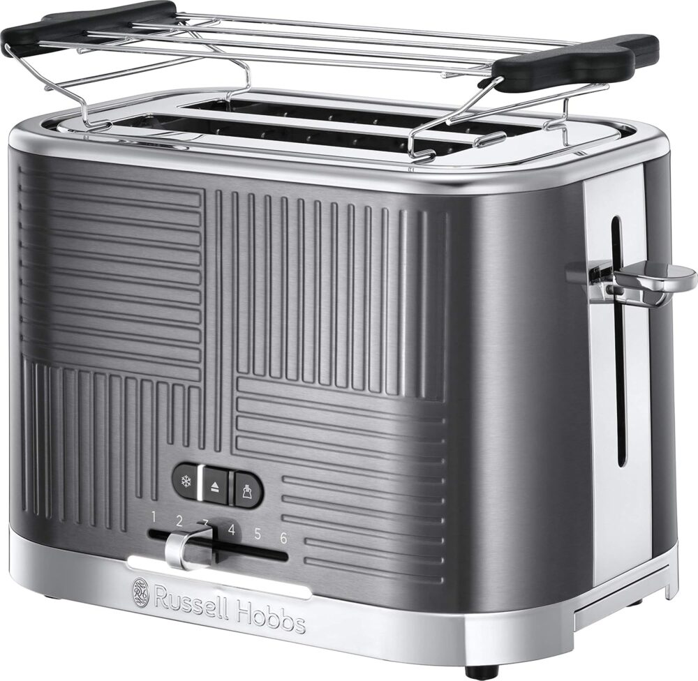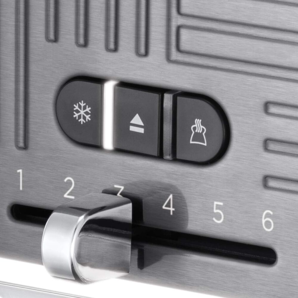 - Torradeira para duas fatias de design metálico de aço inoxidável com relevo