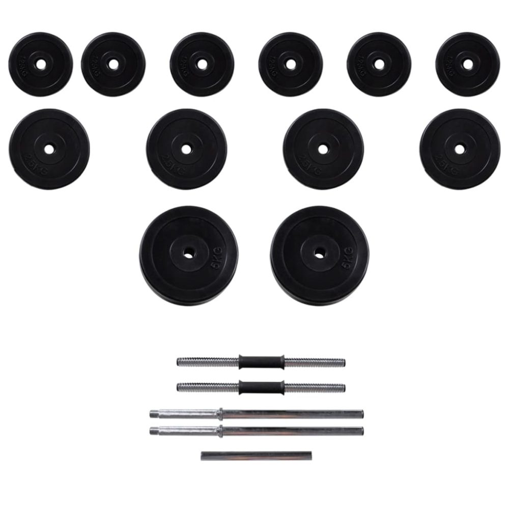 O conjunto de barras e halteres apresenta barras maciças cromadas com molas de fixação rápida (para as barras), punhos ranhurados antiderrapantes e fechos de rosca (para as barras dos halteres) para a fixação segura dos discos de peso. Pode exercitar-se sem se preocupar com questões de segurança. Os discos de peso são feitos com um revestimento de polietileno robusto. Podem ser combinados de várias maneiras para diferentes propósitos de treino.