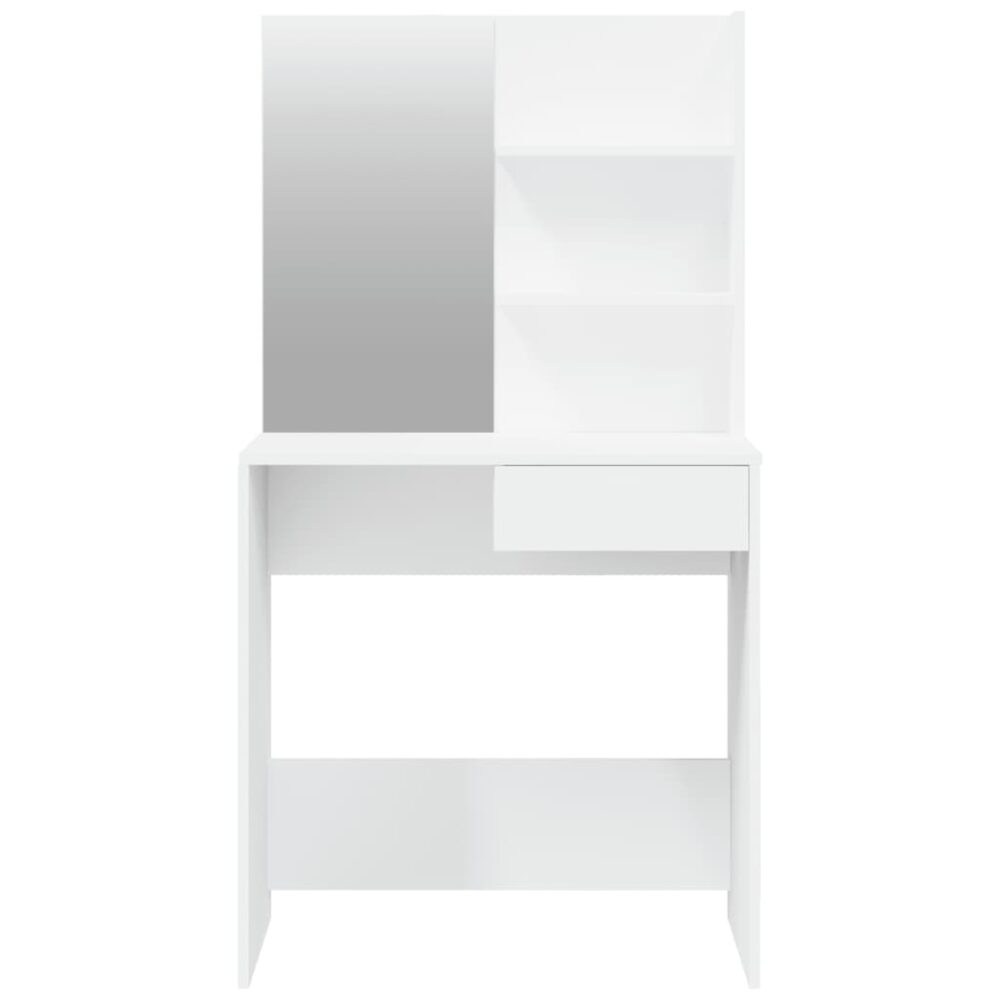 Com linhas retas refinadas e uma forma assimétrica repleta de originalidade, este toucador vai certamente surpreender toda a gente! Material estável: os derivados de madeira possuem uma qualidade excecional e oferecem uma superfície suave bem como força, estabilidade e resistência à humidade.Espelho utilitário: a mesa de cosmética com espelho é perfeita para a sua rotina diária de beleza. O espelho permite que cuide da sua pele facial e, ainda, coloque maquilhagem!Amplo espaço de arrumação: o tampo do toucador, as prateleiras de dois níveis na mesa e uma gaveta por baixo proporcionam um espaço amplo para um acesso fácil à sua maquilhagem, joias e artigos essenciais do dia-a-dia.Design moderno: o design moderno apresenta linhas simples e um aspeto minimalista como parte do seu estilo de design de interiores. Atenção:Para evitar que o produto se vire, deve utilizar o dispositivo de fixação na parede fornecido.