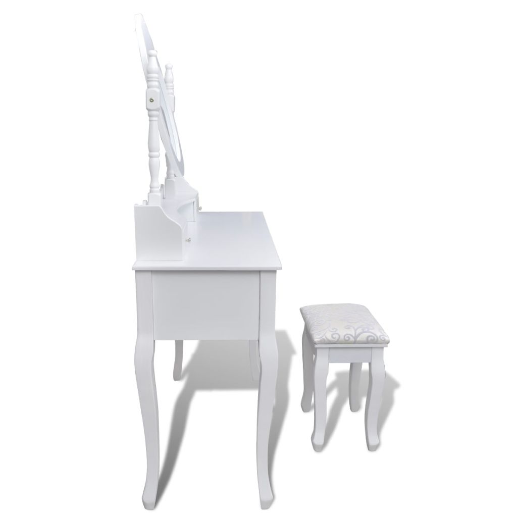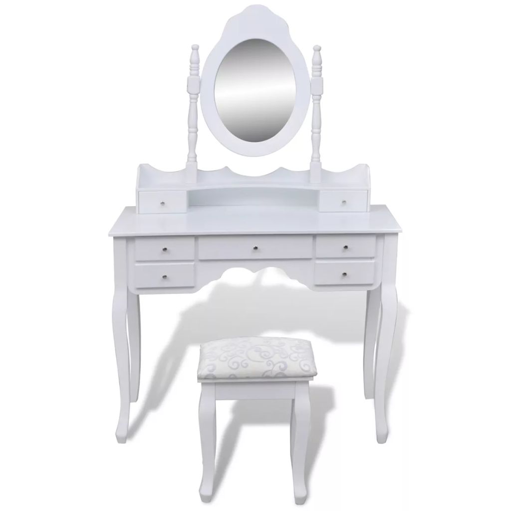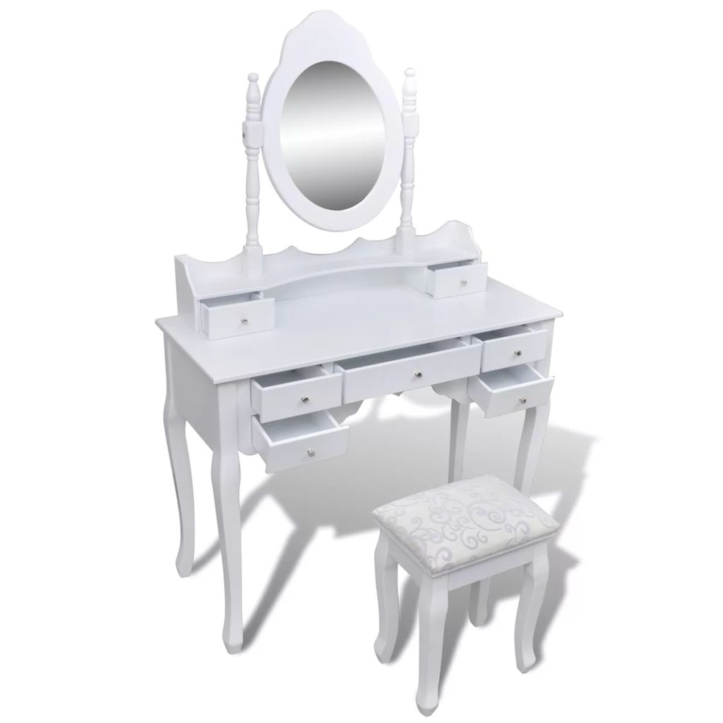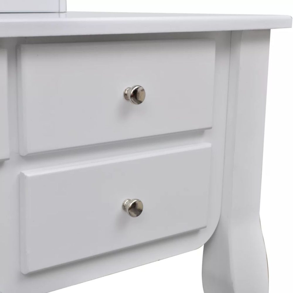 O espelho da mesa tem uma estrutura sem fixação, podendo girá-lo para o ângulo desejado. Uma admirável surpresa é a moldura do espelho e a mesa que podem ser usadas separadamente. Sete gavetas elegantes oferecem espaço adicional para os seus ornamentos, cosméticos e outros pertences pessoais. Este conjunto de tocador com banco será certamente o destaque em qualquer ambiente.