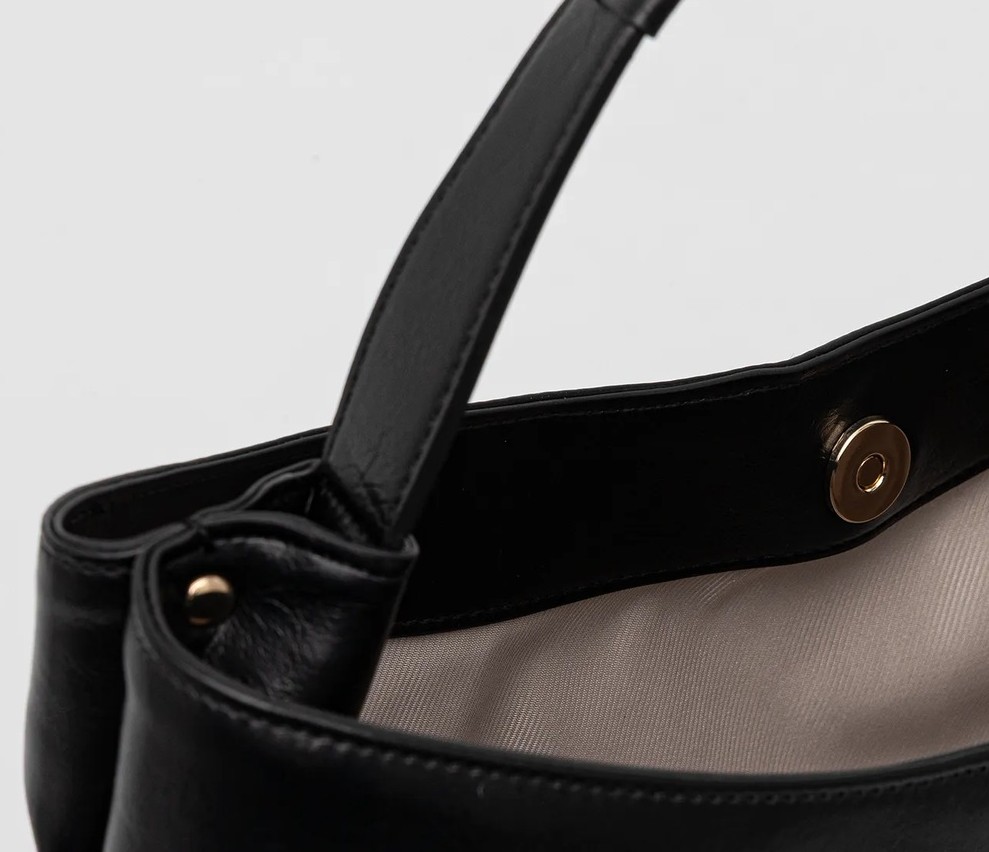 Mala , 1 alça de ombro, 1 bolso interno, espaços internos para celular, detalhes contrastantes, fecho de botão, logotipo