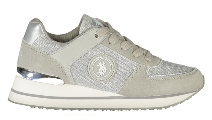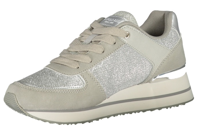 Calçado desportivo com atacadores, detalhes de contraste, estampa, logótipo.