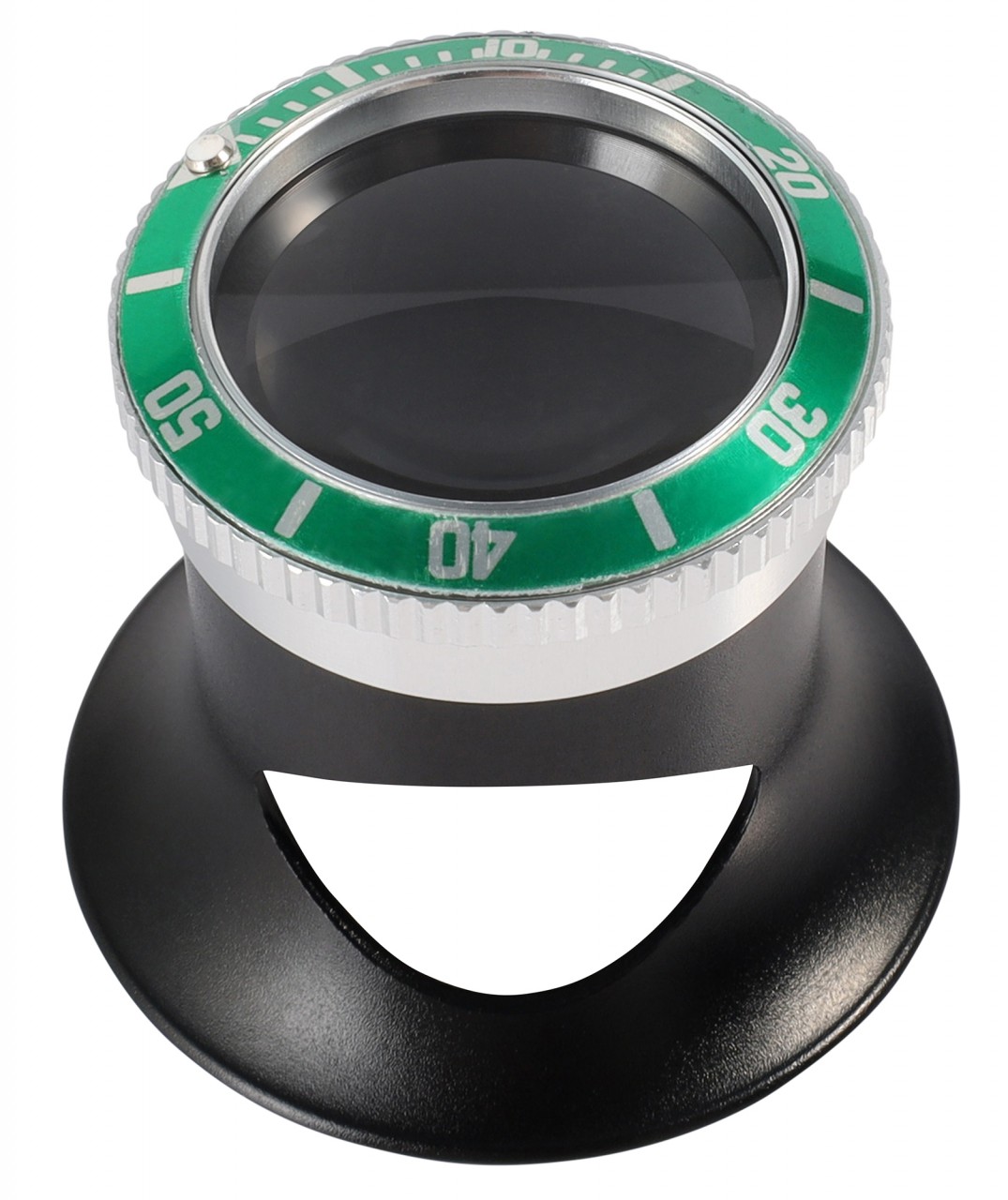 Esta lupa de relojoeiro assenta confortavelmente na mão e tem um peso agradável graças à utilização de materiais de alta qualidade, como o alumínio e o vidro. A parte de alumínio, que segura a lupa, pode ser desaparafusada para substituir o vidro da lupa. O vidro da própria lupa tem um efeito de ampliação de 15 e é, por isso, agradável para os olhos quando se efectuam trabalhos delicados. Este pequeno ajudante está disponível nas cores verde, preto, azul/preto, azul/vermelho com partes prateadas no bordo e na parte superior virada para o olho. As dimensões são as mesmas: C 3,2 cm × P 3,85 cm.
