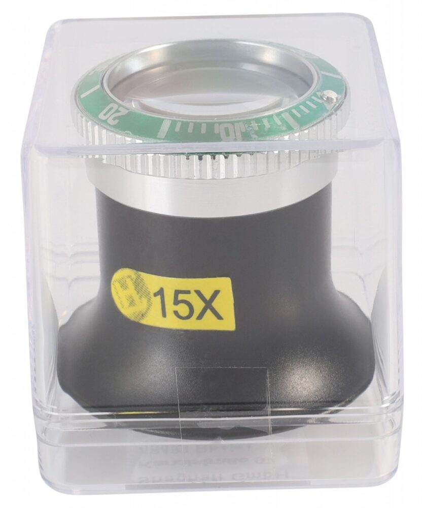 Esta lupa de relojoeiro assenta confortavelmente na mão e tem um peso agradável graças à utilização de materiais de alta qualidade, como o alumínio e o vidro. A parte de alumínio, que segura a lupa, pode ser desaparafusada para substituir o vidro da lupa. O vidro da própria lupa tem um efeito de ampliação de 15 e é, por isso, agradável para os olhos quando se efectuam trabalhos delicados. Este pequeno ajudante está disponível nas cores verde, preto, azul/preto, azul/vermelho com partes prateadas no bordo e na parte superior virada para o olho. As dimensões são as mesmas: C 3,2 cm × P 3,85 cm.