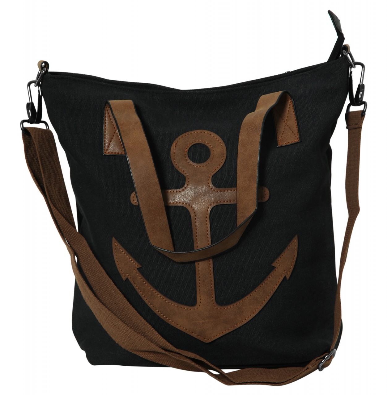 A bolsa de ombro marítima é feita de tecido. É decorado na frente com um motivo de âncora que, assim como as alças e os elementos individuais, é feito de imitação de couro. A bolsa é a companheira perfeita para o dia a dia, mas também para sair à noite, pois tem muito espaço de arrumação e numerosos compartimentos. Devido ao seu tamanho ideal, pode ser usado perfeitamente ao ombro ou a tiracolo, pois possui outra alça removível e ajustável que pode ser ajustada a um comprimento total máximo de aproximadamente 125 cm. O compartimento principal pode ser aberto ou fechado com zíper. O interior da bolsa oferece outras opções de armazenamento, onde há outro compartimento menor com zíper e dois bolsos para celular. Há também um compartimento com zíper externo.