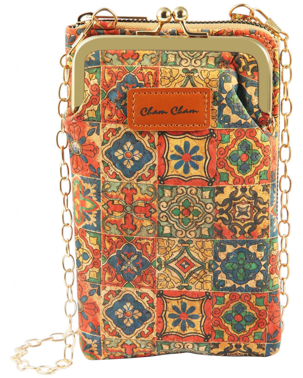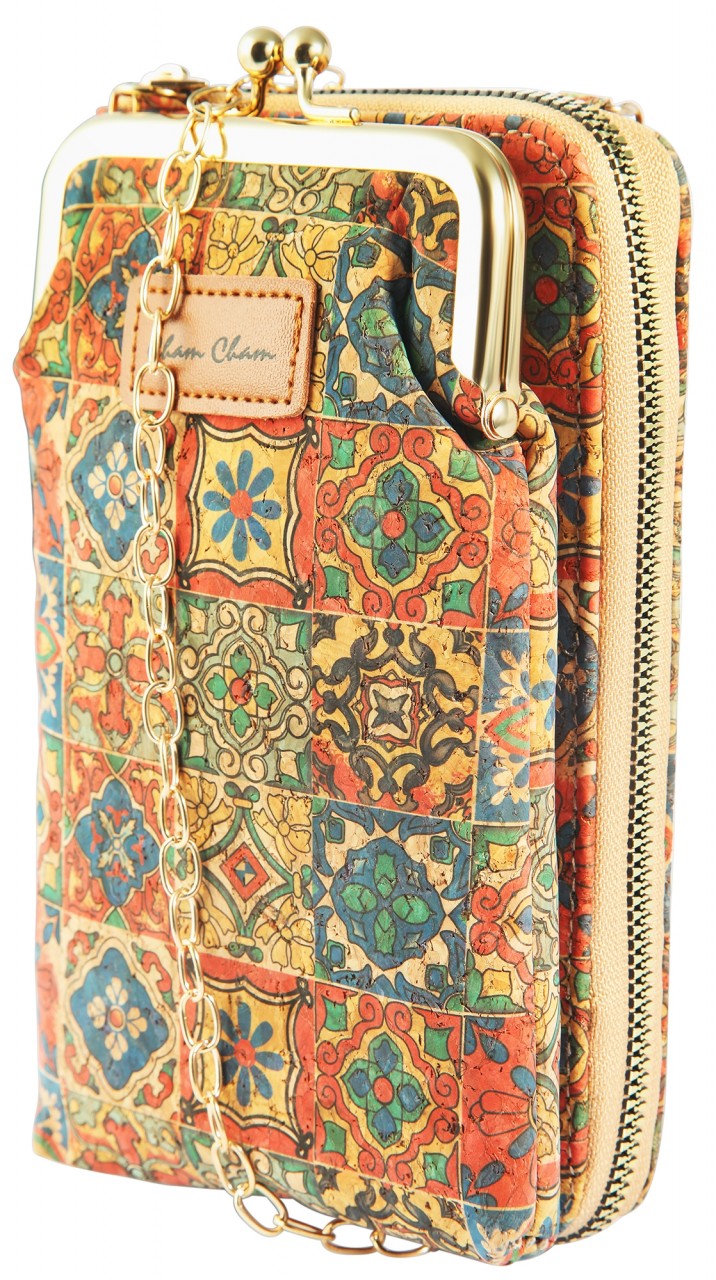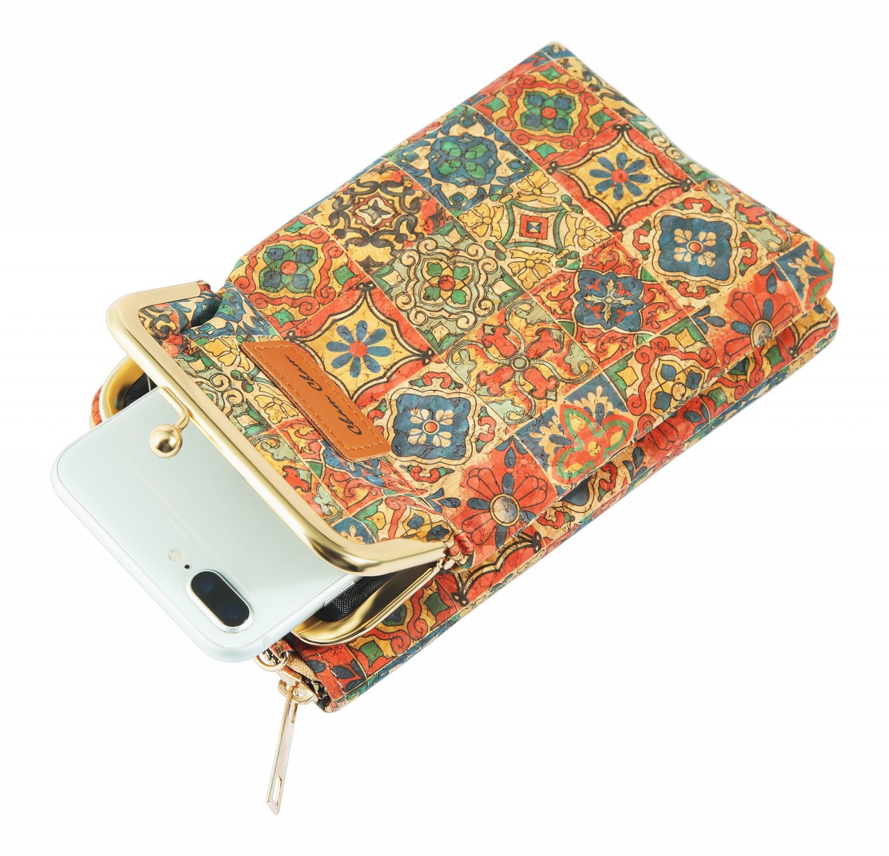 A bolsa de ombro para telemóvel com carteira é feita em cortiça e está disponível em várias cores e padrões da moda. É ideal para muitas atividades de lazer e pode substituir o incômodo de carregar uma bolsa grande.  Apesar do seu tamanho compacto, oferece espaço de armazenamento suficiente para guardar tudo o que é importante de forma clara e segura. Possui carteira que abre e fecha com zíper. Contém 6 compartimentos para cartões, 2 compartimentos para notas e 1 compartimento com zíper para pequenos trocos. O tamanho da bolsa de ombro para celular resulta de um comprimento de 19 cm, 11.5 cm de largura e 4.5 de espessura. A alça é ajustável e removível.