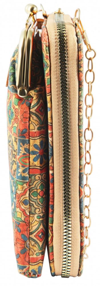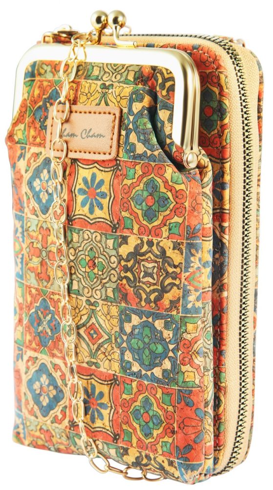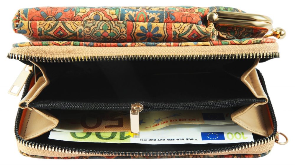A bolsa de ombro para telemóvel com carteira é feita em cortiça e está disponível em várias cores e padrões da moda. É ideal para muitas atividades de lazer e pode substituir o incômodo de carregar uma bolsa grande.  Apesar do seu tamanho compacto, oferece espaço de armazenamento suficiente para guardar tudo o que é importante de forma clara e segura. Possui carteira que abre e fecha com zíper. Contém 6 compartimentos para cartões, 2 compartimentos para notas e 1 compartimento com zíper para pequenos trocos. O tamanho da bolsa de ombro para celular resulta de um comprimento de 19 cm, 11.5 cm de largura e 4.5 de espessura. A alça é ajustável e removível.