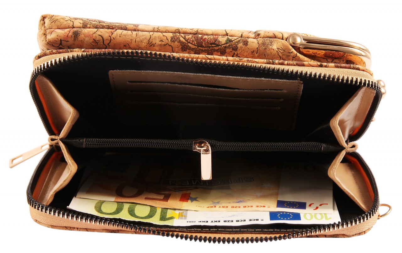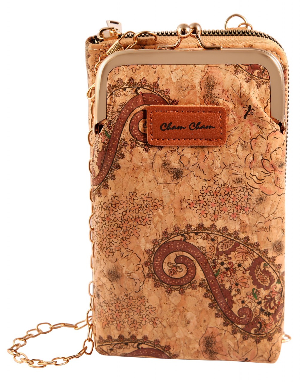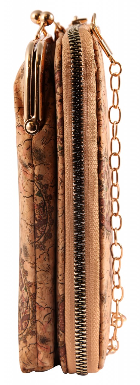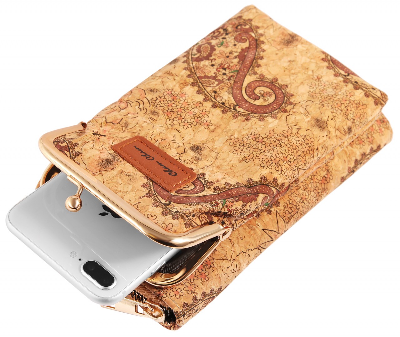 A bolsa de ombro para telemóvel com carteira é feita em cortiça e está disponível em várias cores e padrões da moda. É ideal para muitas atividades de lazer e pode substituir o incômodo de carregar uma bolsa grande. Apesar do seu tamanho compacto, oferece espaço de armazenamento suficiente para guardar tudo o que é importante de forma clara e segura. Possui carteira que abre e fecha com zíper. Contém 6 compartimentos para cartões , 2 compartimentos para notas e 1 compartimento com zíper para moedas. A capa do telemóvel pode ser facilmente aberta e fechada separadamente usando um fecho de clipe clássico. O tamanho da bolsa de ombro para telemóvel resulta de um comprimento de 19 cm, 11.5 cm de largura e 4.5 de espessura. Também é removível.