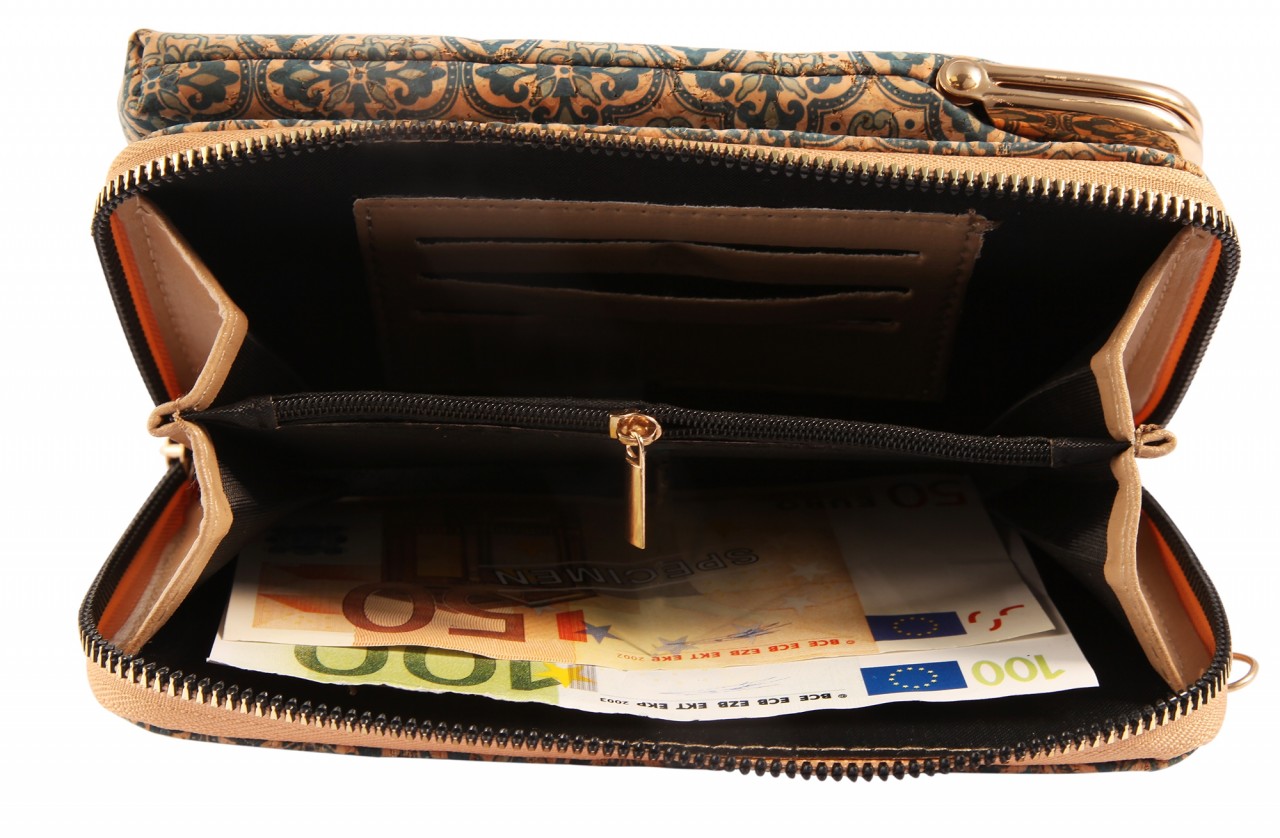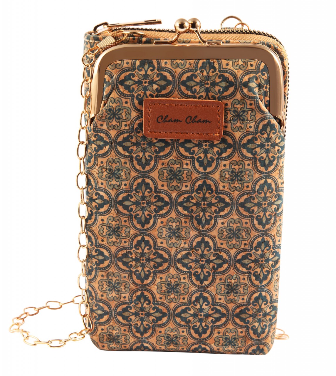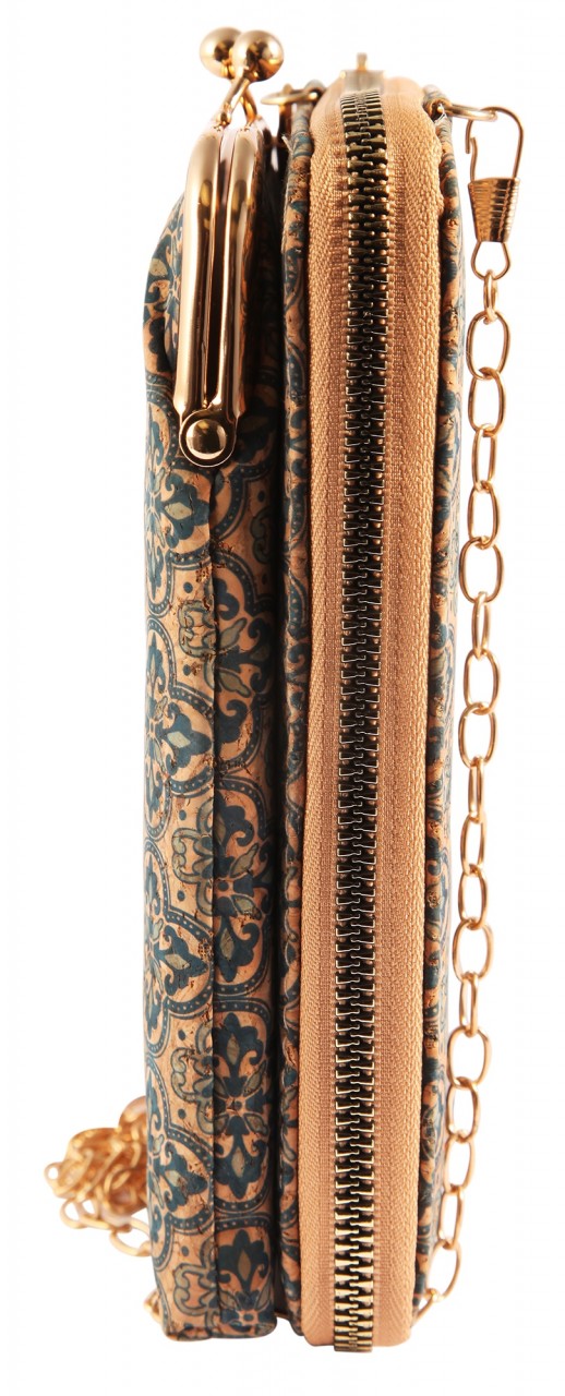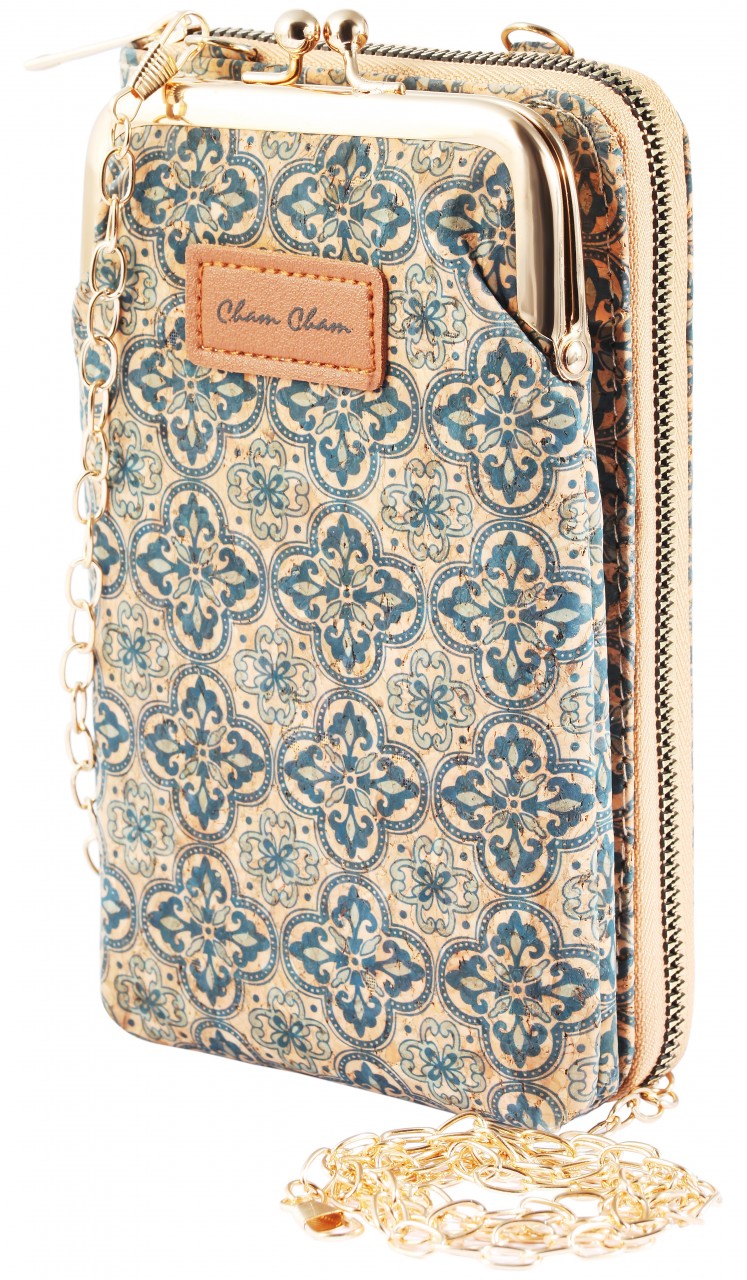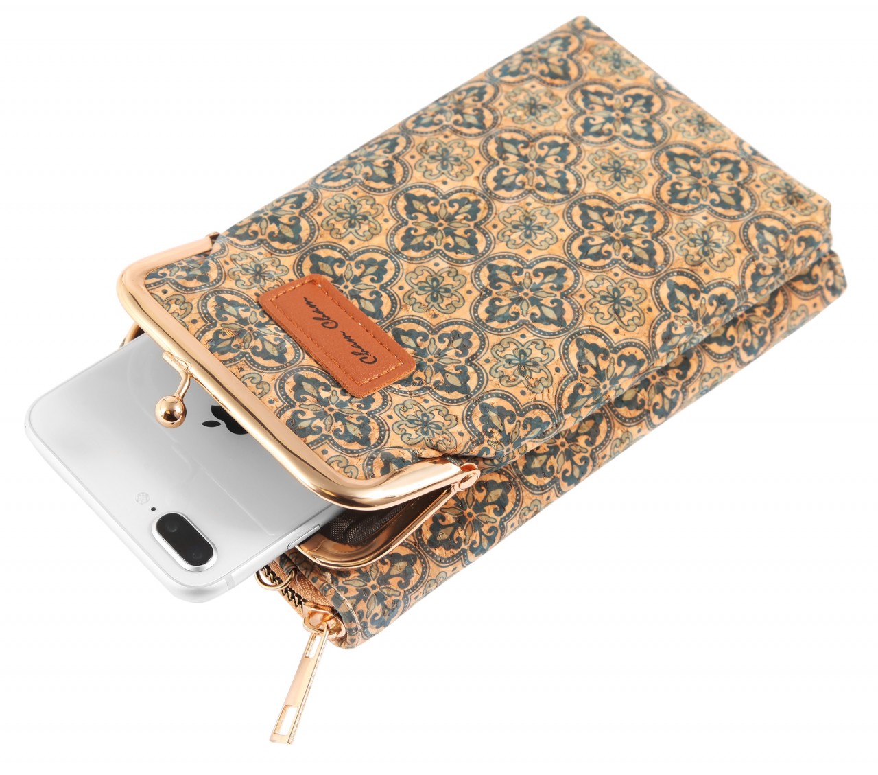 A bolsa de ombro para telemóvel com carteira é feita em cortiça e está disponível em várias cores e padrões da moda. É ideal para muitas atividades de lazer e pode substituir o incômodo de carregar uma bolsa grande. Apesar do seu tamanho compacto, oferece espaço de armazenamento suficiente para guardar tudo o que é importante de forma clara e segura. Possui carteira que abre e fecha com zíper. Contém 6 compartimentos para cartões , 2 compartimentos para notas e 1 compartimento com zíper para moedas. A capa do telemóvel pode ser facilmente aberta e fechada separadamente usando um fecho de clipe clássico. O tamanho da bolsa de ombro para telemóvel resulta de um comprimento de 19 cm, 11.5 cm de largura  e 4.5 de espessura. Também é removível.