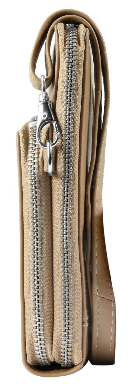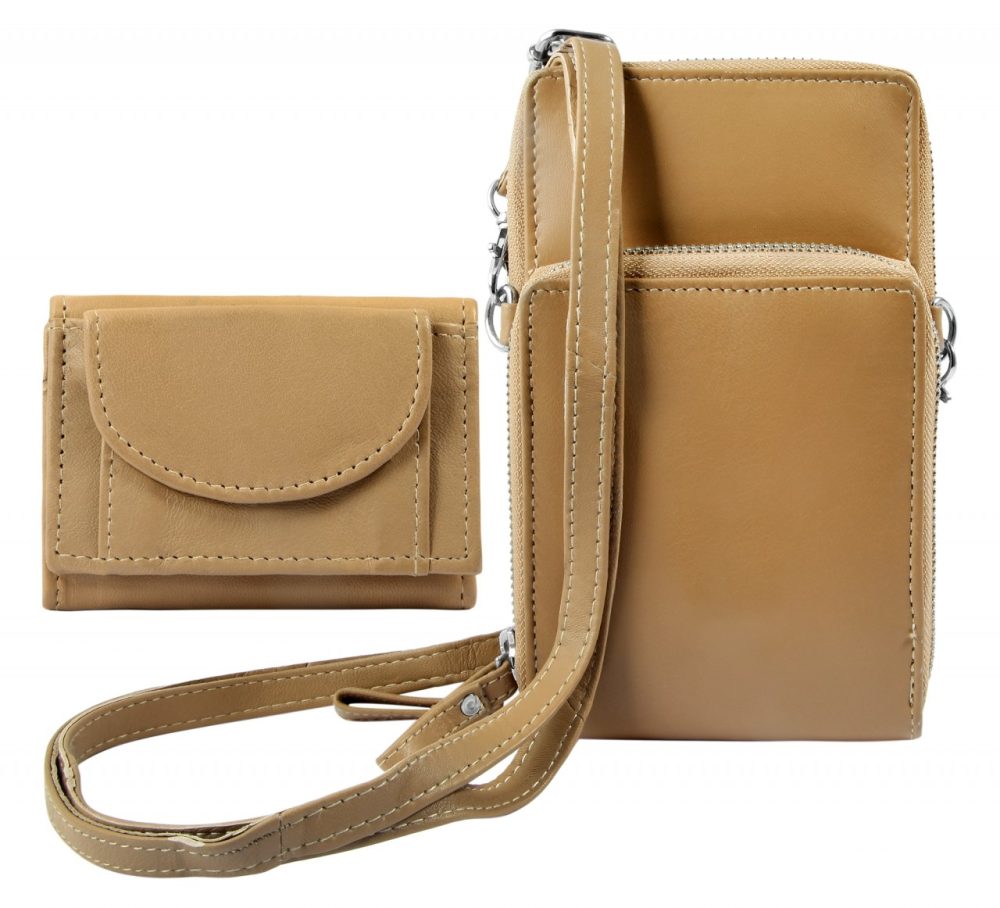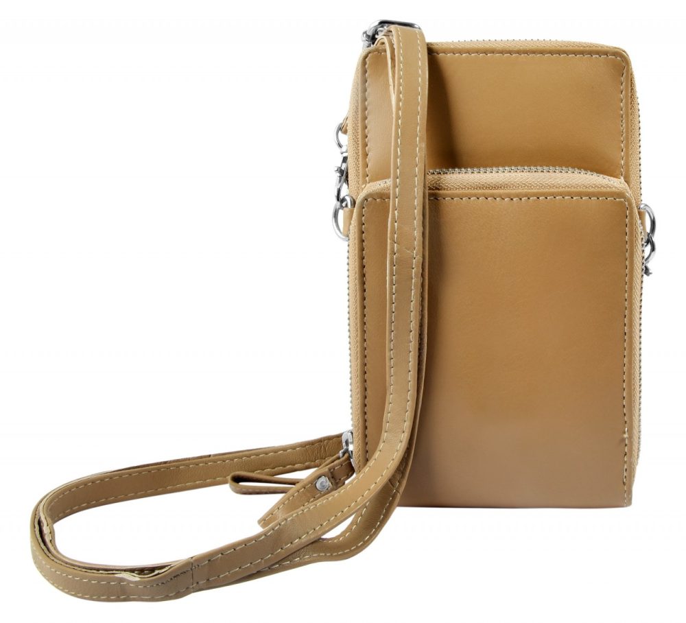 A compacta bolsa de ombro para telemóvel, incluindo uma mini carteira adicional, é feita de pele  e está disponível em várias cores da moda. É ideal para muitas atividades de lazer e pode substituir o incômodo de carregar uma bolsa grande. Apesar do seu tamanho compacto, oferece espaço de armazenamento suficiente para guardar tudo o que é importante de forma clara e segura. Possui um grande compartimento com zíper, que se divide em dois compartimentos na parte interna e oferece espaço para dois cartões. O compartimento com zíper na frente oferece opções de armazenamento adicionais. O compartimento contém ainda uma mini carteira, também confeccionada em pele. O tamanho da bolsa de ombro para telemóvel é 19,5 cm de comprimento, 12 cm de largura e 4 cm de espessura quando vazia. A alça também é feita de pele e tem comprimento máximo de 145 cm, e é ajustável e removível.