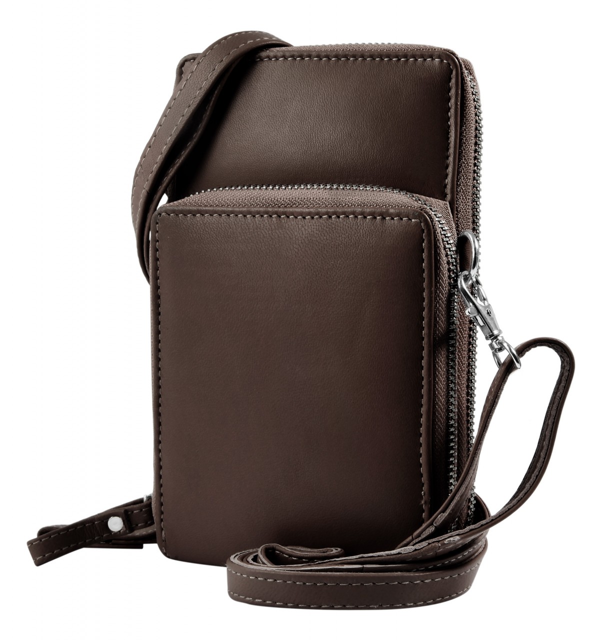 A compacta bolsa de ombro para telemóvel, incluindo uma mini carteira adicional, é feita de pele e está disponível em várias cores da moda. É ideal para muitas atividades de lazer e pode substituir o incômodo de carregar uma bolsa grande. Apesar do seu tamanho compacto, oferece espaço de armazenamento suficiente para guardar tudo o que é importante de forma clara e segura. Possui um grande compartimento com zíper, que se divide em dois compartimentos na parte interna e oferece espaço para dois cartões. O compartimento com zíper na frente oferece opções de armazenamento adicionais. O compartimento contém ainda uma mini carteira, também confeccionada em pele.O tamanho da bolsa de ombro para telemóvel é 19,5 cm de comprimento, 12 cm de largura e 4 cm de espessura quando vazia. A alça também é feita de pele e tem comprimento máximo de 145 cm, e é ajustável e removível.