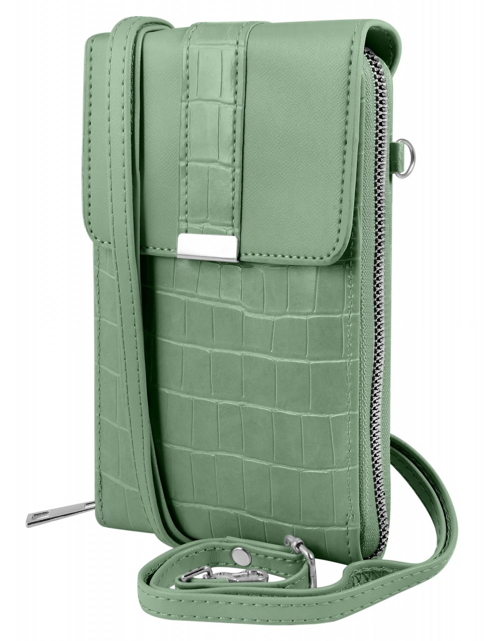 A bolsa de ombro compacta para telemóvel está disponível em várias cores da moda. É ideal para muitas atividades de lazer e pode substituir o incômodo de carregar uma bolsa grande. Apesar do seu tamanho compacto, oferece espaço de armazenamento suficiente para guardar tudo o que é importante de forma clara e segura. O tamanho da bolsa de ombro para telemóvel é 17,5 cm de comprimento, 11 cm de largura e 3 cm de espessura quando vazia. A alça também é feita de pele sintético e tem comprimento máximo de 125 cm. Pode ser ajustável e removível.