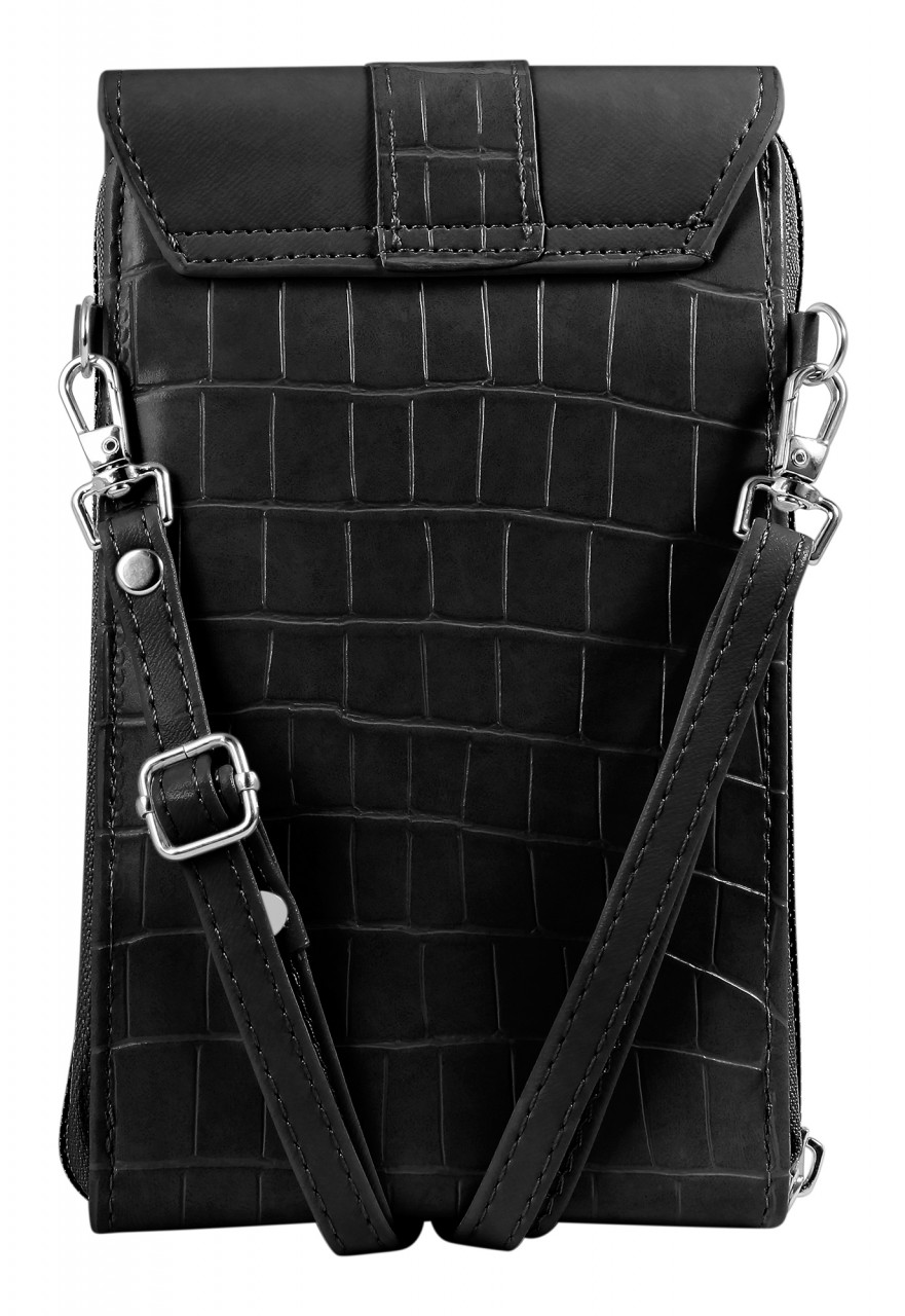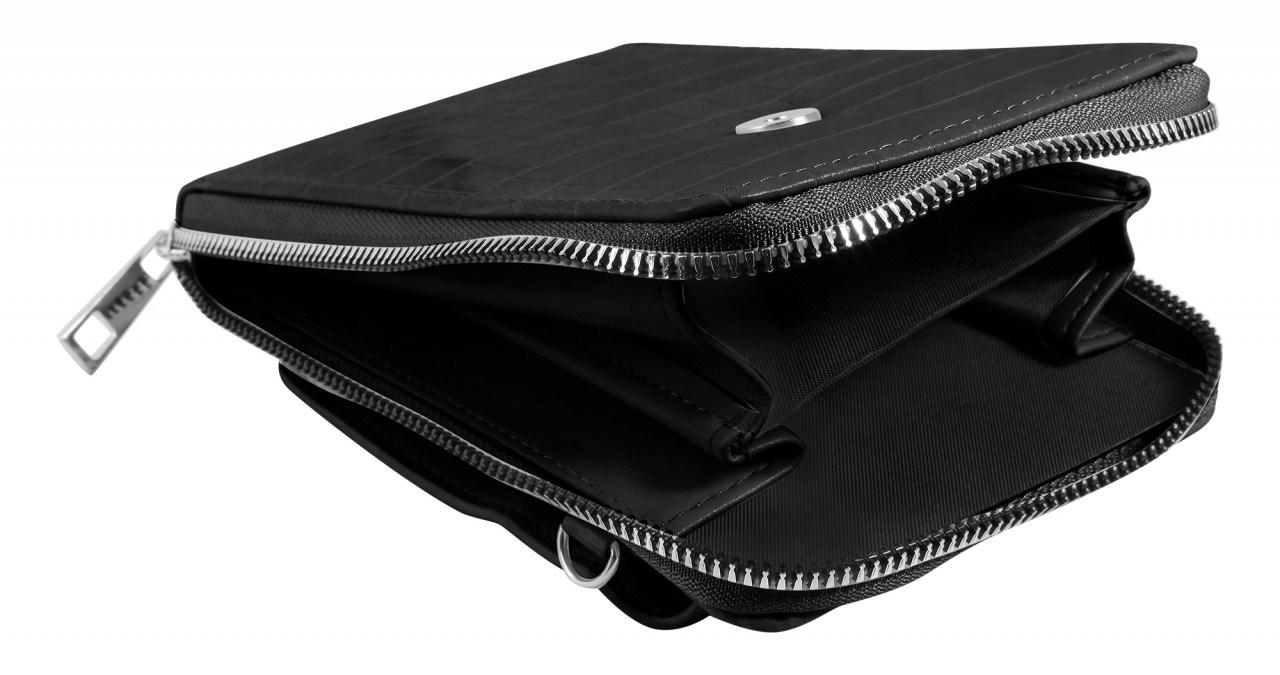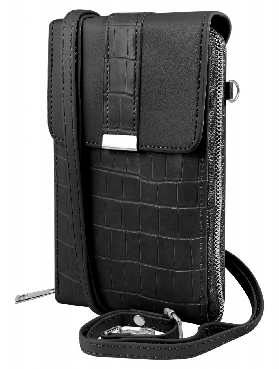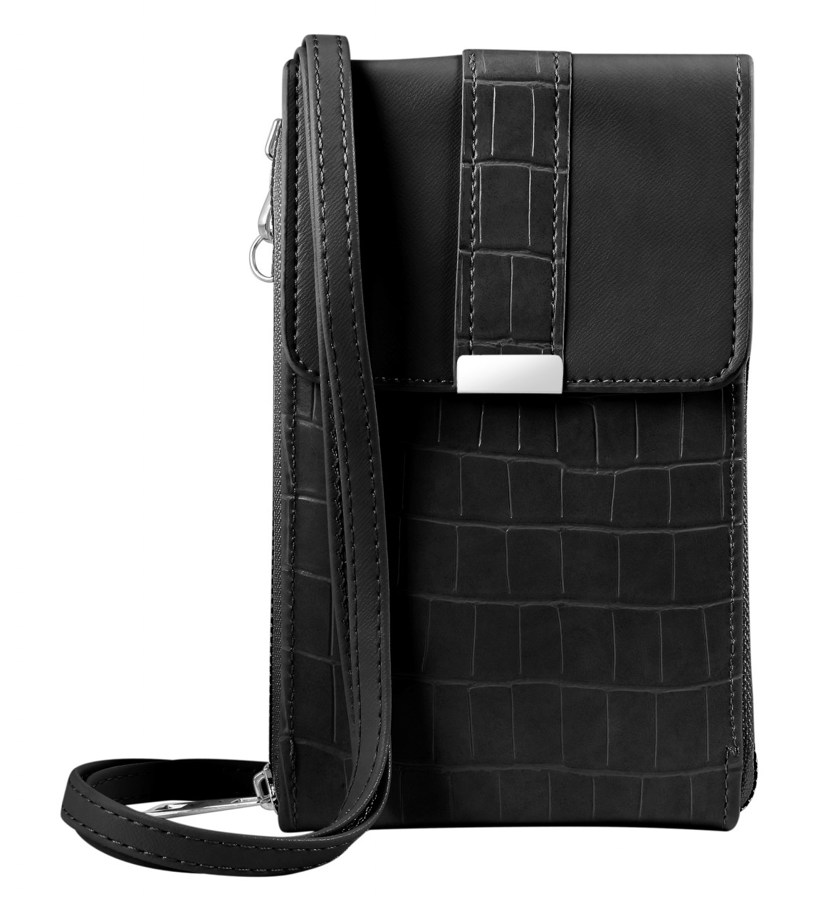 A bolsa de ombro compacta para telemóvel é feita de pele sintética e está disponível em várias cores da moda. É ideal para muitas atividades de lazer e pode substituir o incômodo de carregar uma bolsa grande. Apesar do seu tamanho compacto, oferece espaço de armazenamento suficiente para guardar tudo o que é importante de forma clara e segura. O tamanho da bolsa de ombro para telemóvel é 17,5 cm de comprimento, 11 cm de largura e 3 cm de espessura quando vazia. A alça também é feita de pele sintético e tem comprimento máximo de 125 cm e é ajustável e removível.