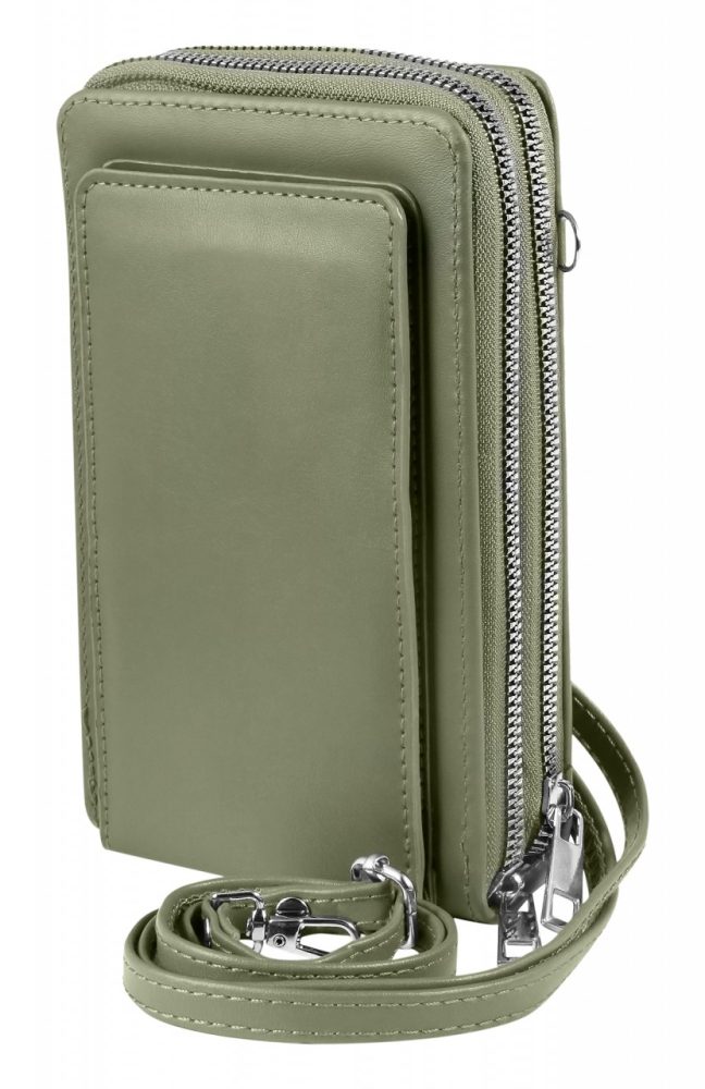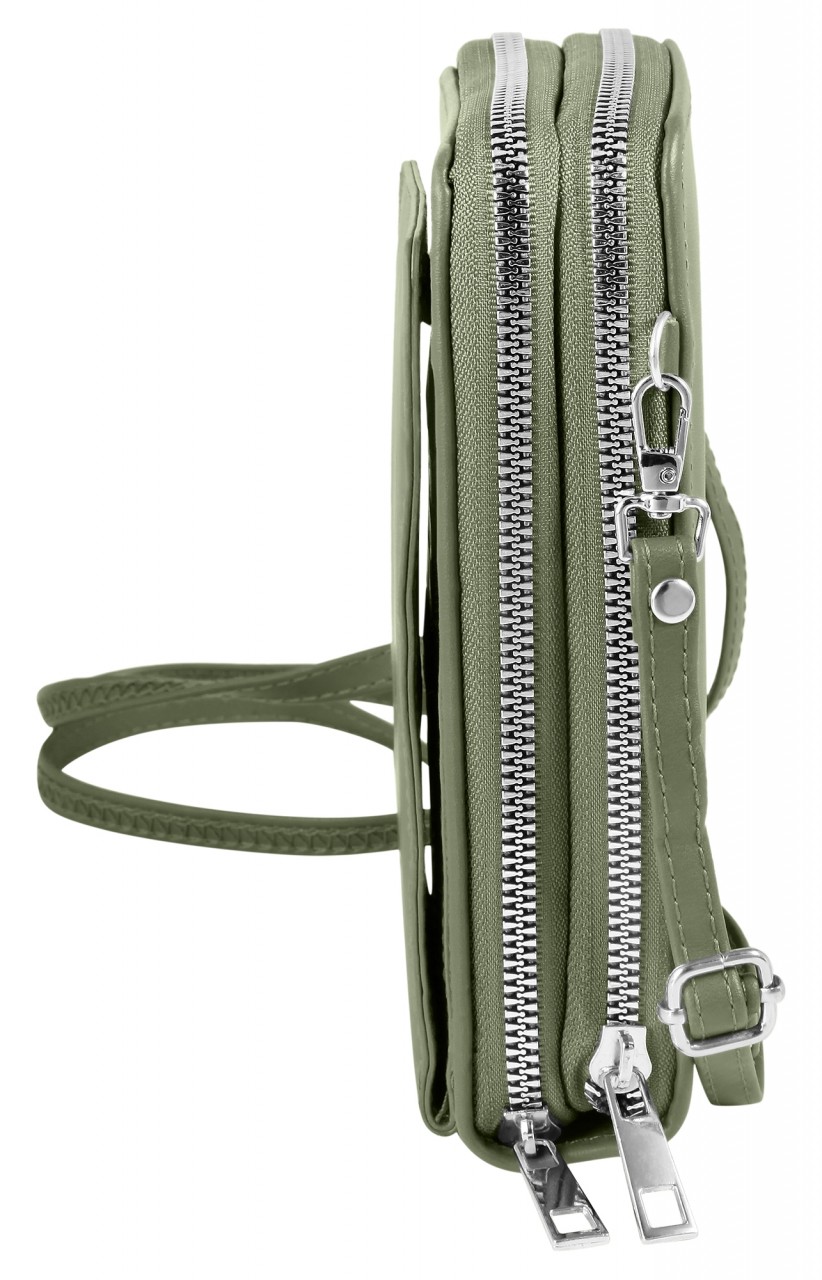 A bolsa de ombro compacta para telemóvel é feita de pele sintética e está disponível em várias cores da moda. É ideal para muitas atividades de lazer e pode substituir o incômodo de carregar uma bolsa grande.  Apesar do seu tamanho compacto, oferece espaço de armazenamento suficiente para guardar tudo o que é importante de forma clara e segura. Possui dois compartimentos com zíper e um compartimento para cartões com espaço para oito cartões. O tamanho da bolsa de ombro para celular é de 18 cm de comprimento, 11 cm de largura e 4 cm de espessura quando vazia.