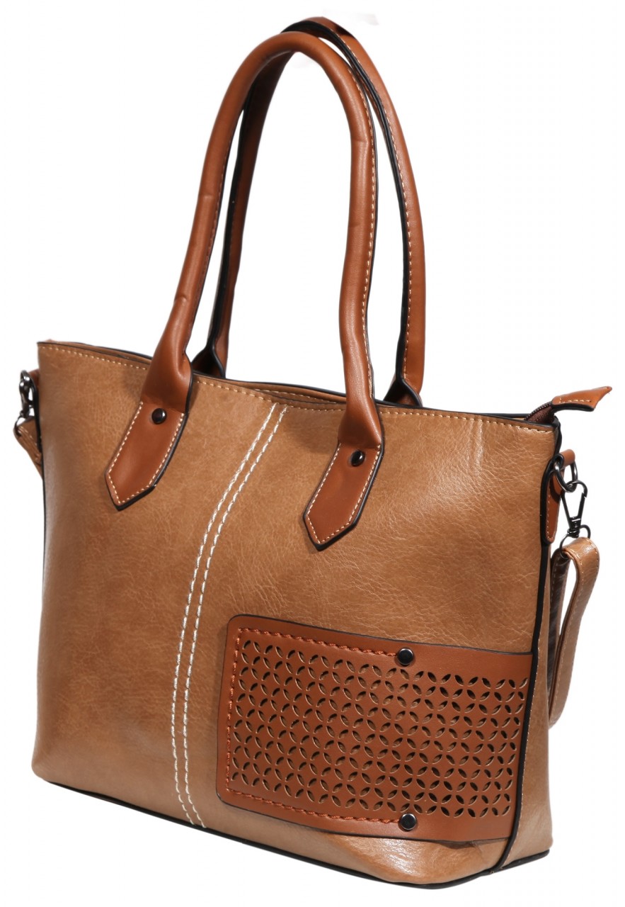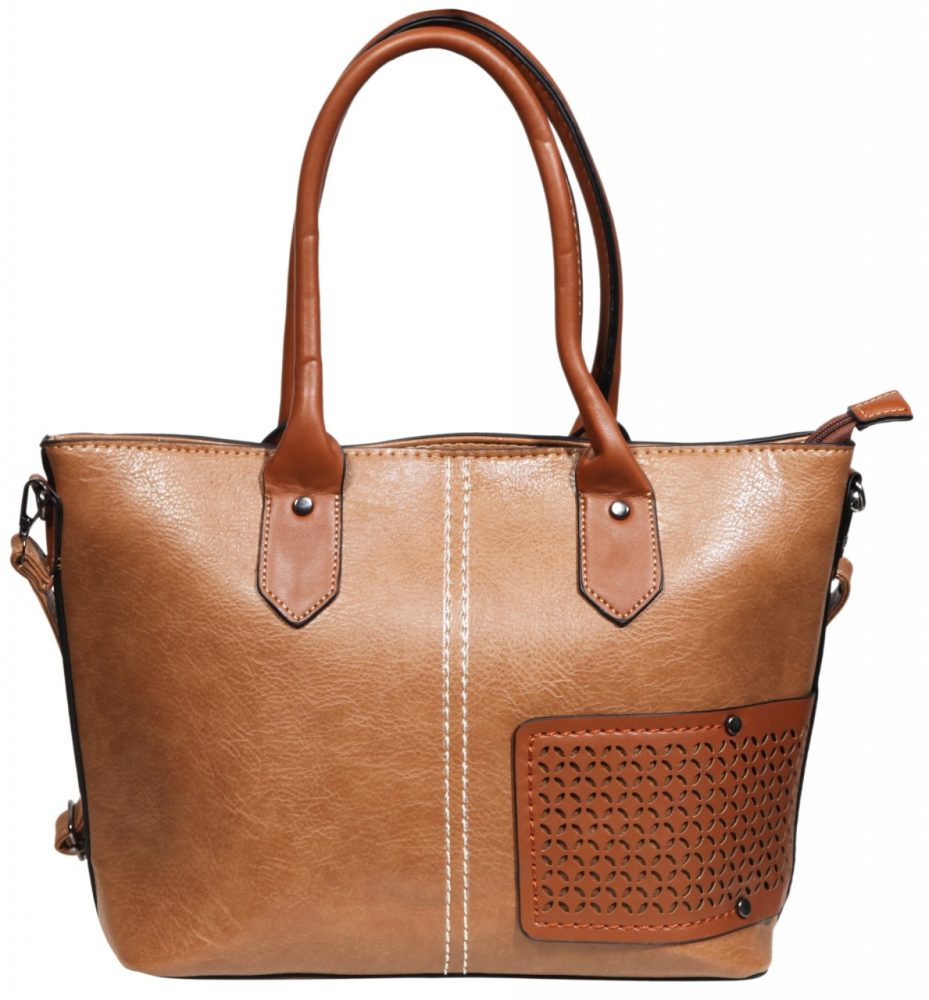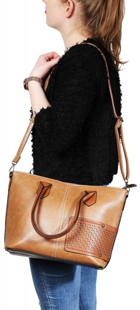 A bolsa feminina é confeccionada em Pele Sintética e toda a superfície possui uma estrutura lisa. A bolsa possui duas alças de transporte curtas, bem como uma alça de transporte longa e removível. Há também um zíper na parte de trás da bolsa, que esconde um compartimento para itens menores. A bolsa possui um grande compartimento principal que pode ser aberto com zíper. No interior, há dois compartimentos internos abertos atrás da frente e um amplo compartimento interno que pode ser fechado atrás das costas. As dimensões da bolsa são 13,5 cm de comprimento, 40 cm de largura e 27 cm de altura.
