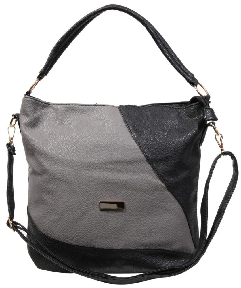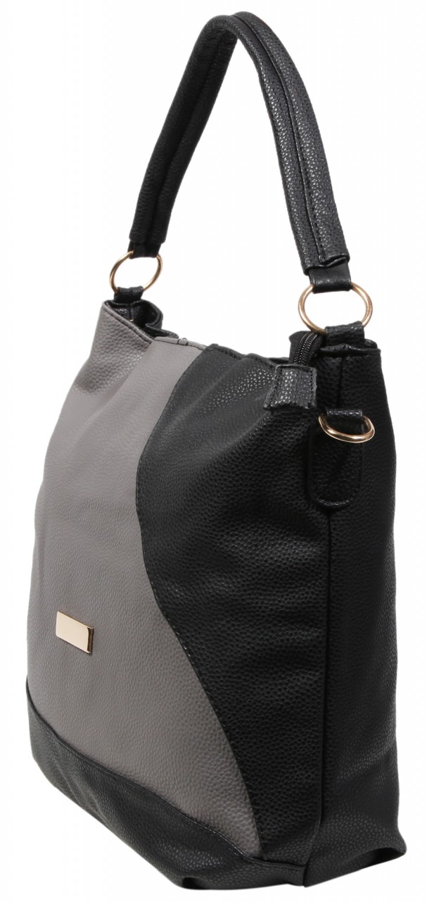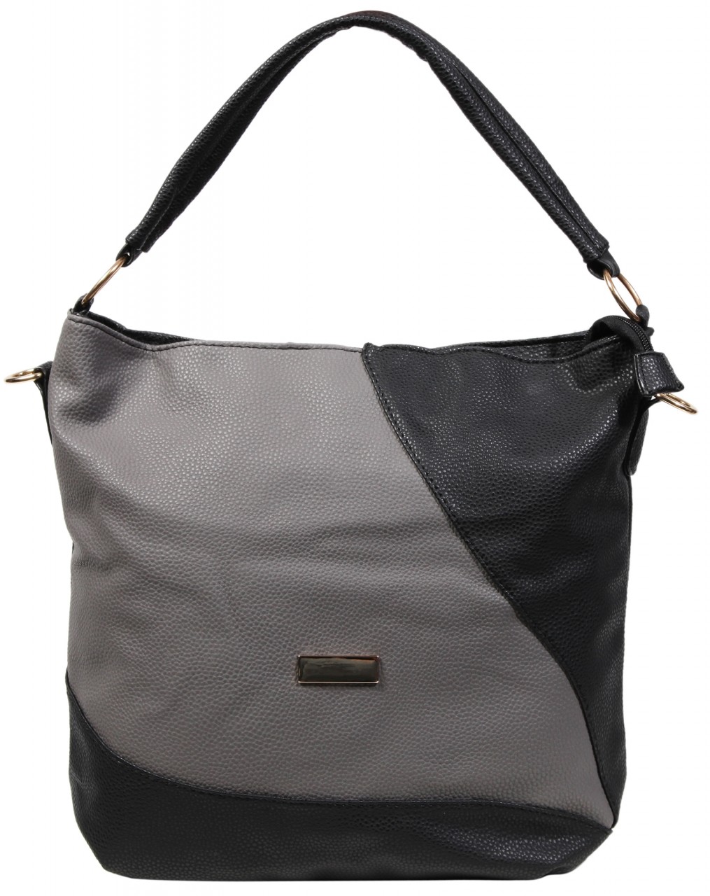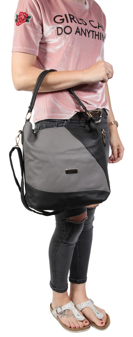A bolsa feminina é confeccionada em imitação de couro e toda a superfície possui uma estrutura lisa. A bolsa possui uma alça de transporte curta e uma alça de transporte longa e removível. A alça de transporte é fixada em pequenos ilhós de metal em ambos os lados da bolsa. Há um zíper na parte de trás da bolsa que esconde um compartimento para itens menores. A bolsa possui um grande compartimento principal que pode ser aberto com zíper. No interior, há dois compartimentos internos abertos atrás da frente e um compartimento interno estreito e fechado atrás das costas.