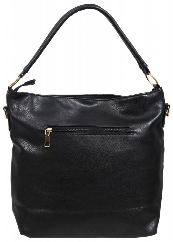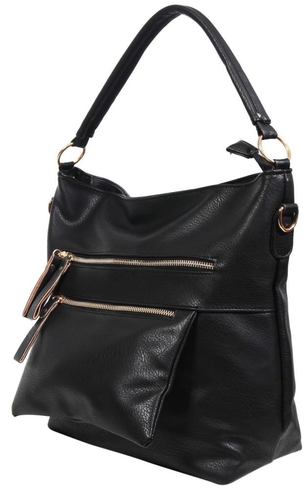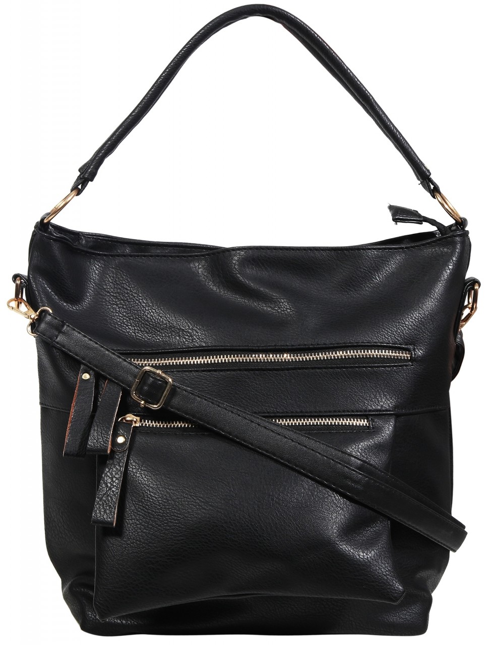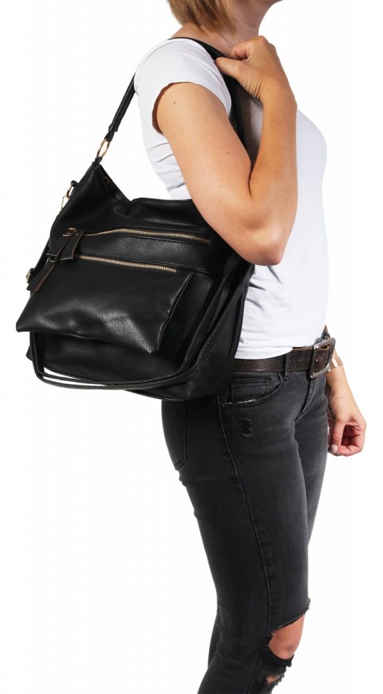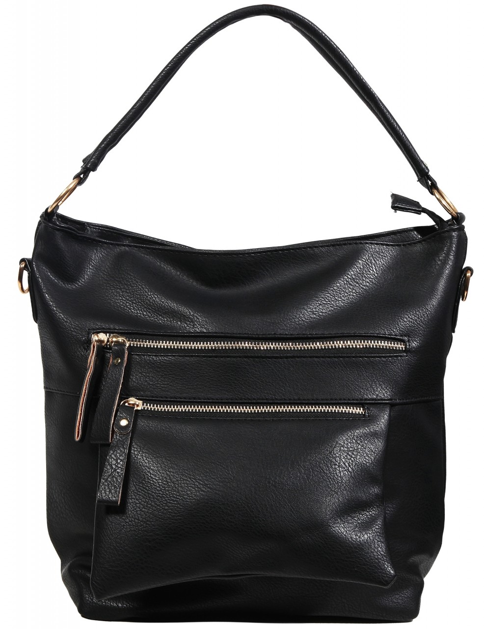 A bolsa é uma bolsa feminina feita de imitação de couro. Toda a superfície possui estrutura lisa e está disponível em diversas cores. A bolsa possui uma alça de transporte curta e uma alça de transporte longa e removível. A alça de transporte é fixada em pequenos ilhós de metal em ambos os lados da bolsa. Na frente da bolsa há dois bolsos externos planos com zíper no meio. Há também um zíper na parte de trás da bolsa, que esconde um compartimento para itens menores. A bolsa possui um grande compartimento principal que pode ser aberto com zíper. No interior, há dois compartimentos internos abertos atrás da frente e um compartimento interno estreito e fechado…