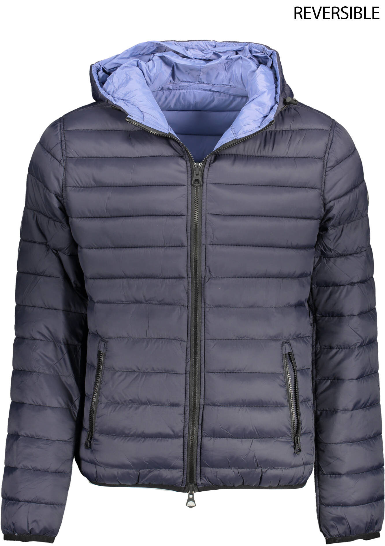 casaco reversível, azul-marinho, 2 bolsos exteriores, 2 bolsos interiores, fecho de correr, aplicação, logótipo