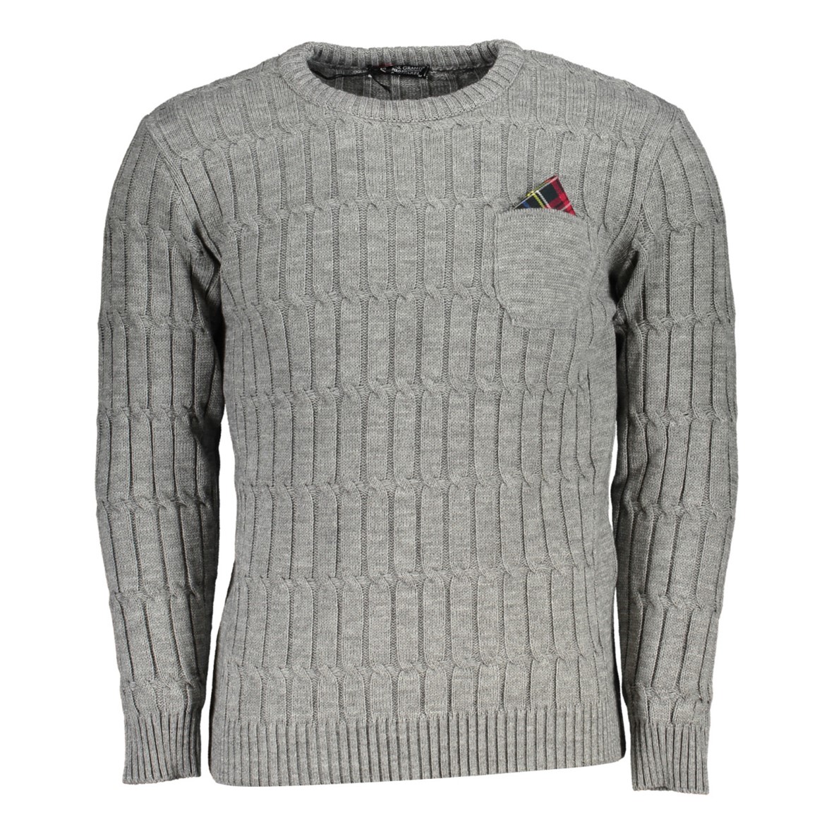 Suéter de manga comprida, gola redonda, bolso, detalhes contrastantes, logótipo.