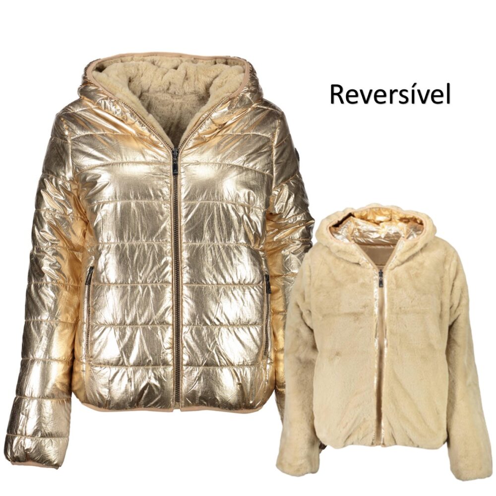 Casaco Reversível Mulher de manga comprida com capuz, reversível, 2 bolsos interiores, 2 bolsos exteriores, fecho de correr, logótipo