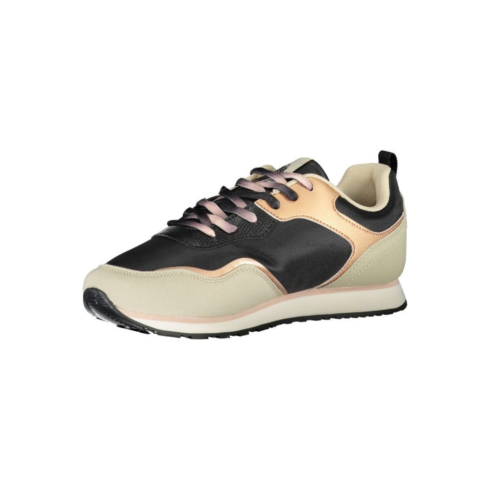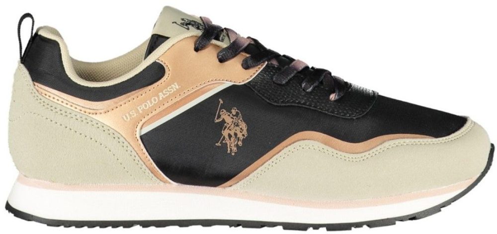 Calçado desportivo com atacadores, detalhes contrastantes, estampa, logótipo.