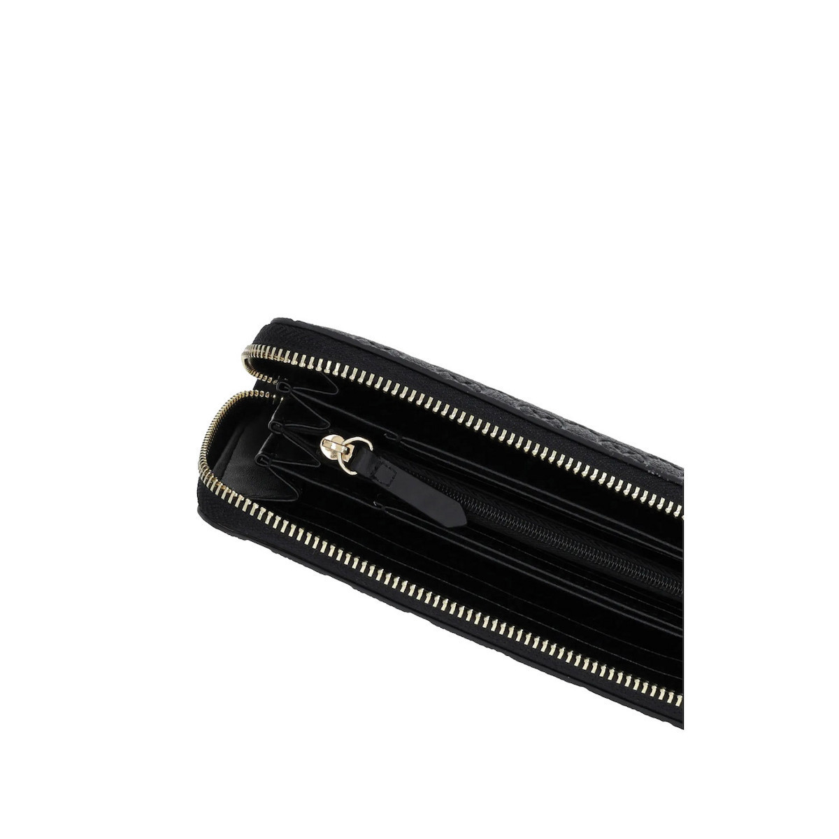 A carteira possui 6 compartimentos, porta-moedas e espaços duplos para cartões, garantindo fácil acesso aos seus pertences. O fecho de correr mantém tudo seguro, enquanto os detalhes em contraste e o logótipo elegante acrescentam um toque moderno e sofisticado.