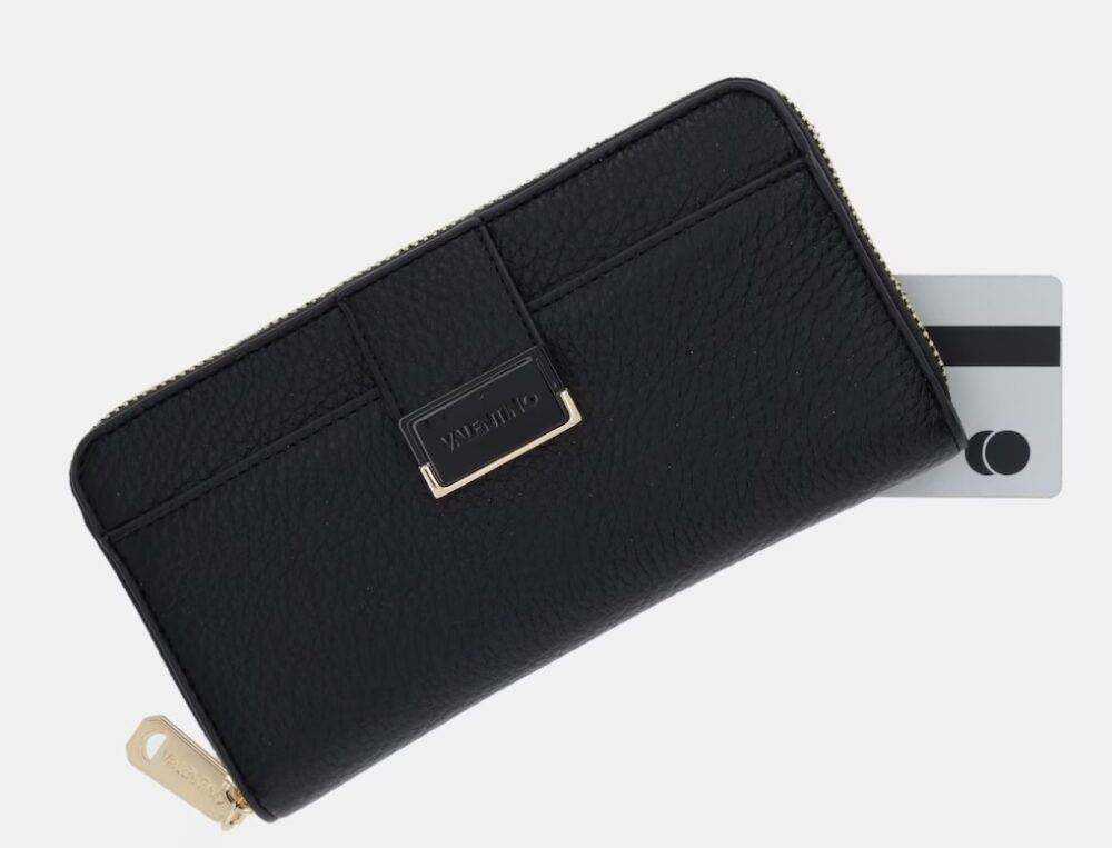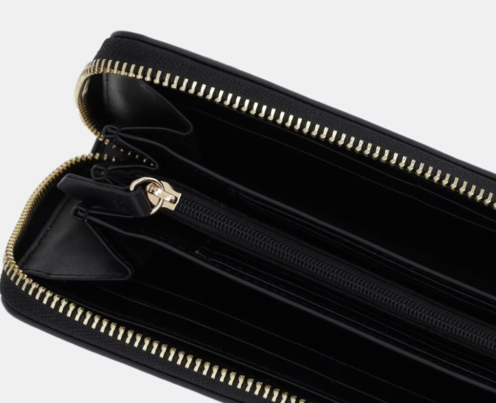 Carteira funcional com 6 compartimentos, 1 bolso externo, porta-moedas e dois espaços para cartões.