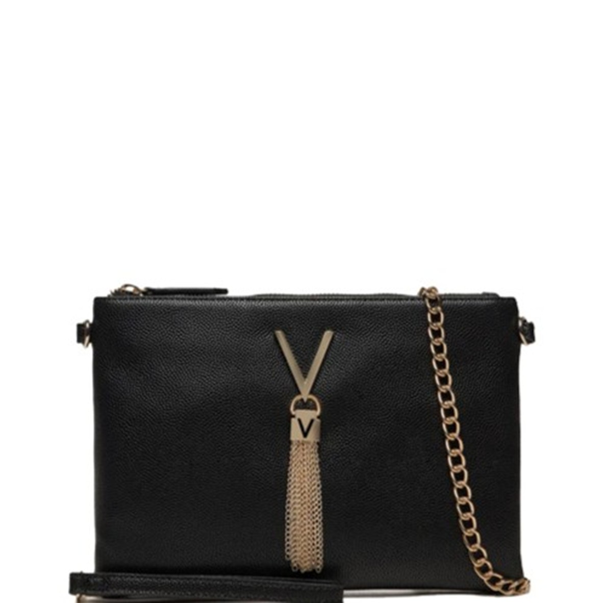 Design Versátil: Inclui uma alça de ombro em corrente amovível e uma alça adicional amovível, permitindo múltiplas formas de uso com detalhes em contraste e o logótipo da marca.
