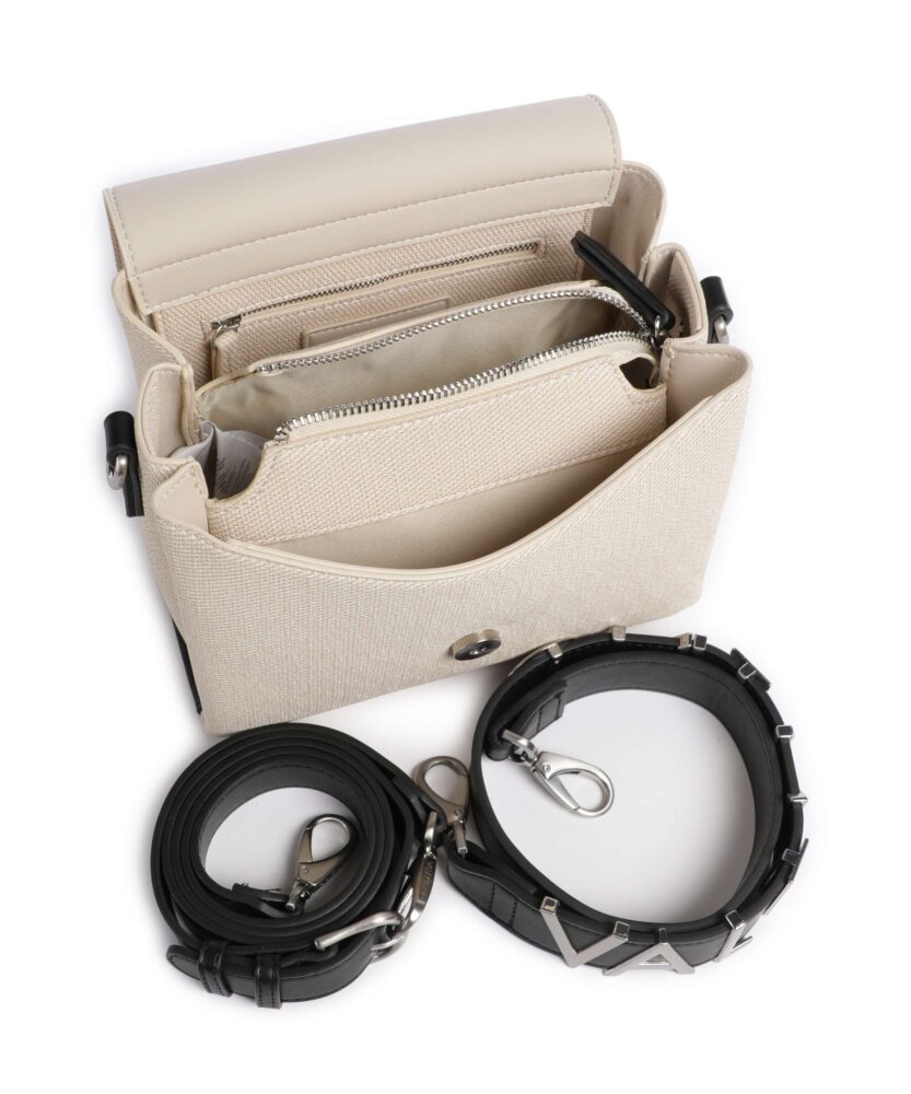 - Pega de mão amovível: Permite usar a mala como uma “handbag” formal.