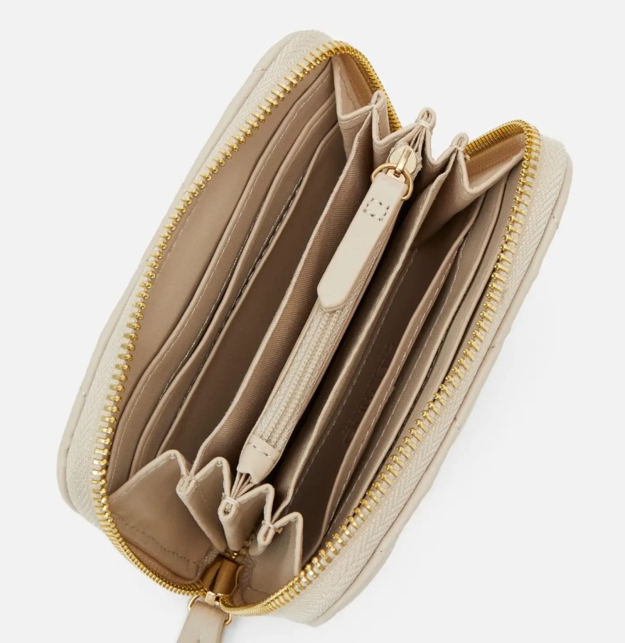 Carteira com 6 compartimentos , porta moedas , espaços duplos para cartões ,pormenores em contrataste, fecho de correr , logotipo