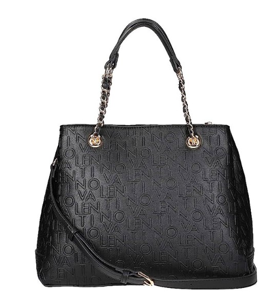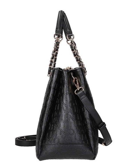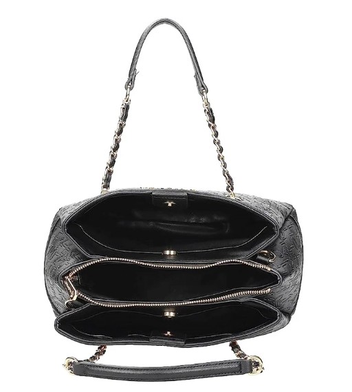 Mala de ombro com 2 alças em corrente, 2 compartimentos , 1 bolso central , 2 bolsos interiores, pormenores em contraste , fecho de correr e botão ,logotipo.