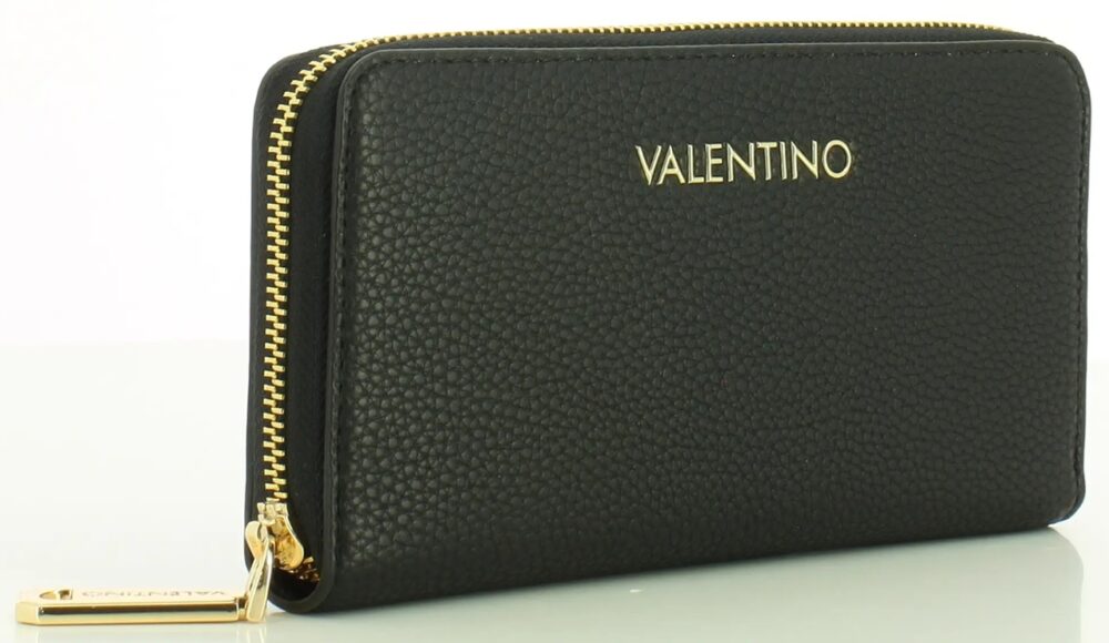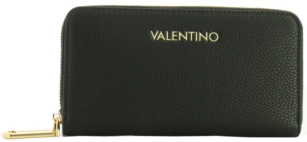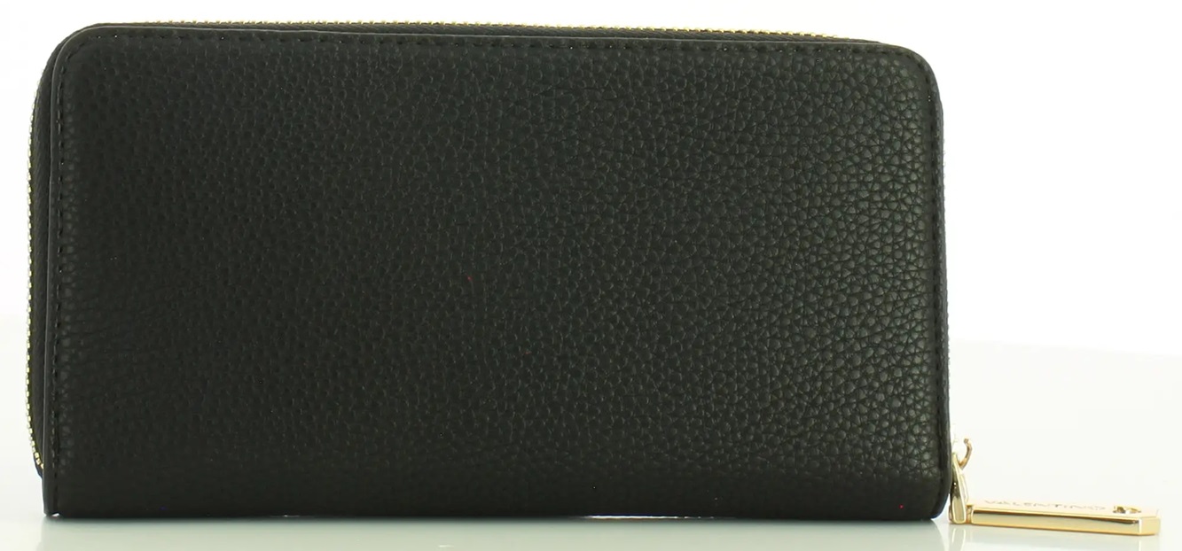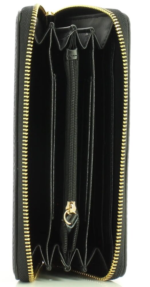 Carteira com 6 compartimentos, bolsa de moedas, espaços internos para cartões, detalhes contrastantes, fecho zíper, logótipo.