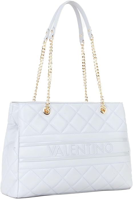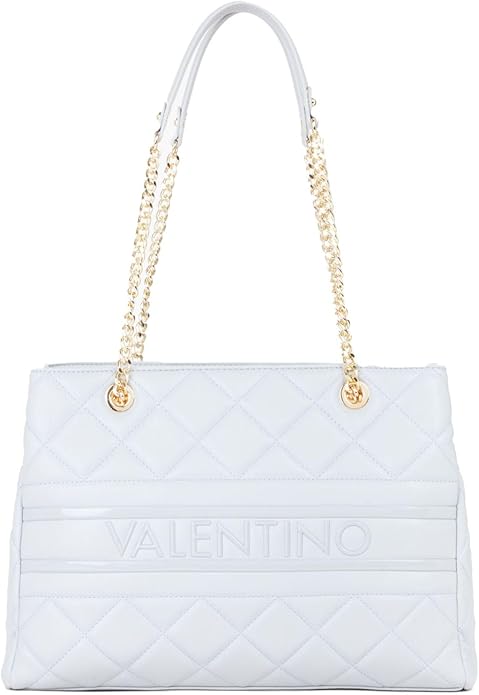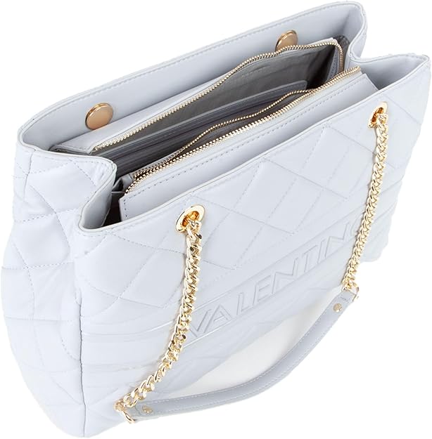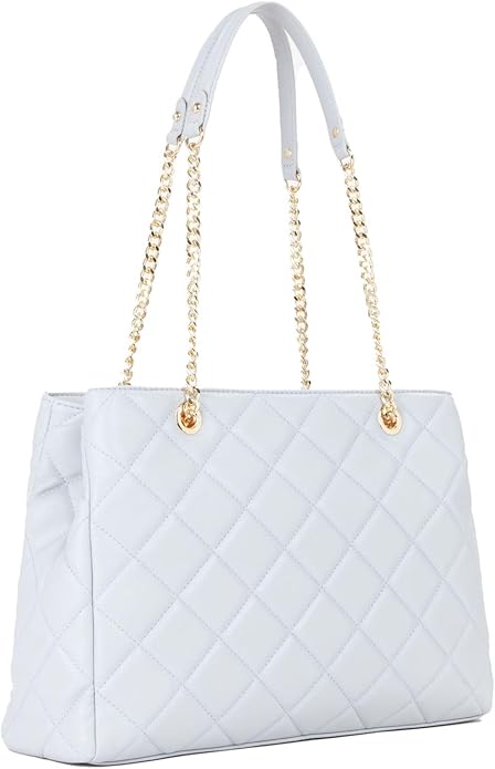 Bolsa de ombro com 2 alças e corrente, 2 compartimentos, 1 bolso interno central, 1 bolso interno, espaços internos para celular, fecho com zíper, detalhes contrastantes, logotipo