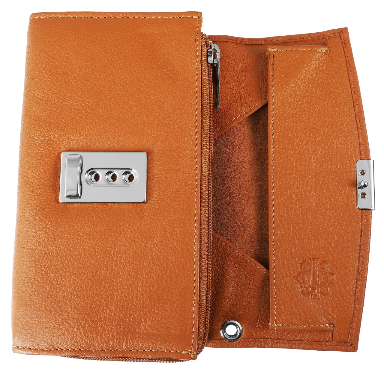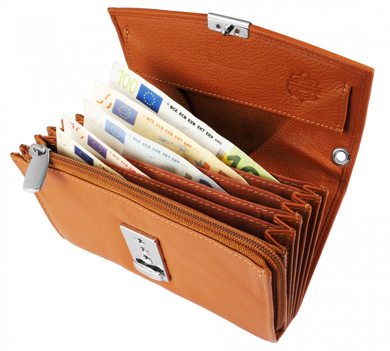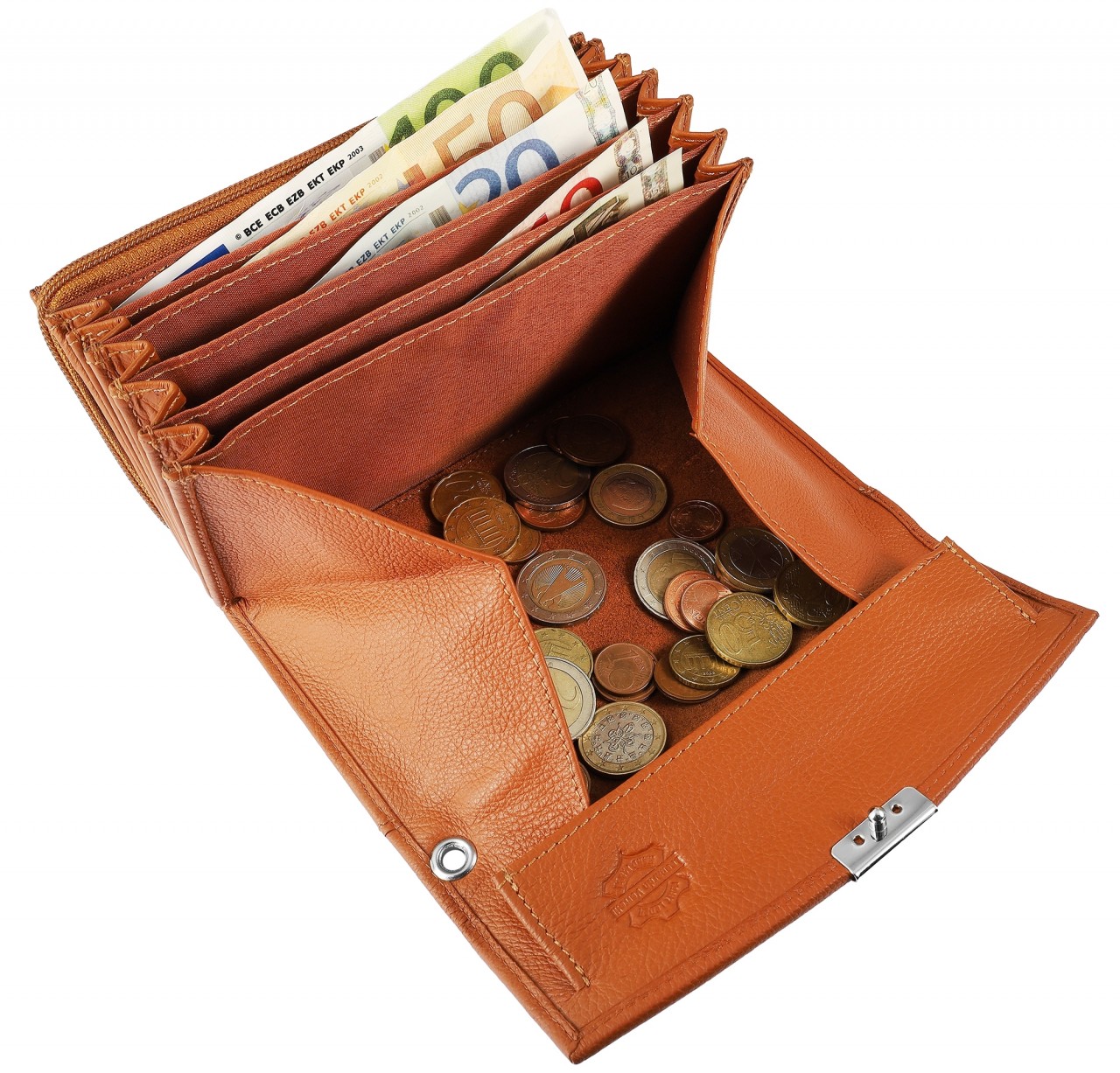 Disposição: compartimento grande para moedas, compartimento para moedas com fecho e três compartimentos para cartões de crédito, cinco compartimentos para notas, um bolso externo adicional
