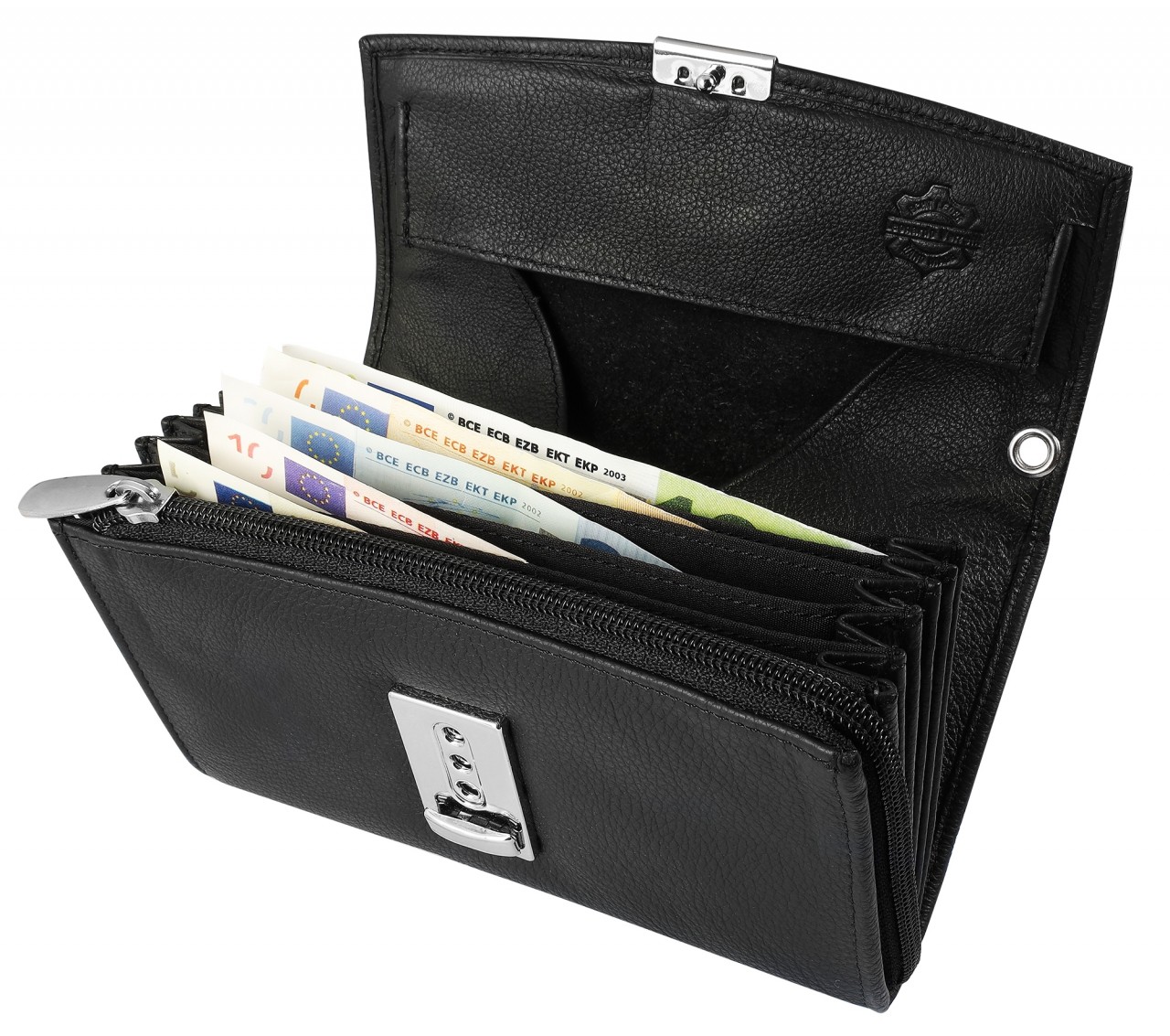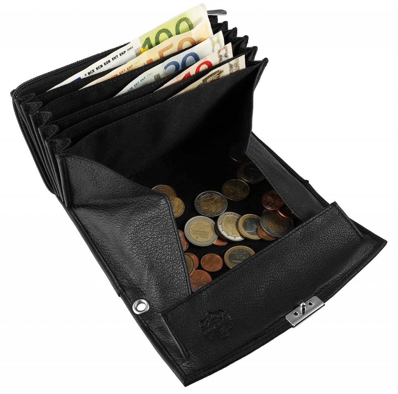 Disposição: compartimento grande para moedas, compartimento para moedas com fecho e três compartimentos para cartões de crédito, cinco compartimentos para notas, um bolso externo adicional